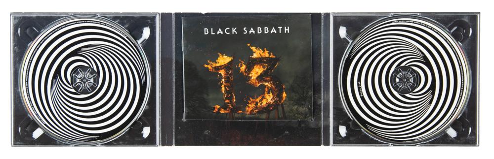 CD for the Black Sabbath album 13, signed inside in silver ink by Ozzy Osbourne, who appears to add a sketch of male genitalia, Geezer Butler, and Tony Iommi. In fine condition, with some light edge wear. The CD is included.