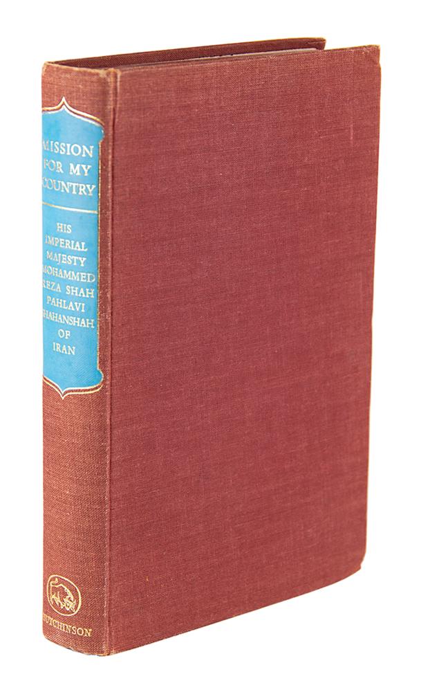 The last Shah of Iran (1919-1980) from 1941 until he was overthrown in the Iranian Revolution of 1979. Signed book: Mission For My Country. First edition. London: Hutchinson, 1961. Hardcover, 6.25 x 9.25, 336 pages. Signed on the title page in black ballpoint, "For Mr. Hector Prud'homme and the University of Hartford, M. R. Pahlavi." In fine condition, with faint sunning to the spine.