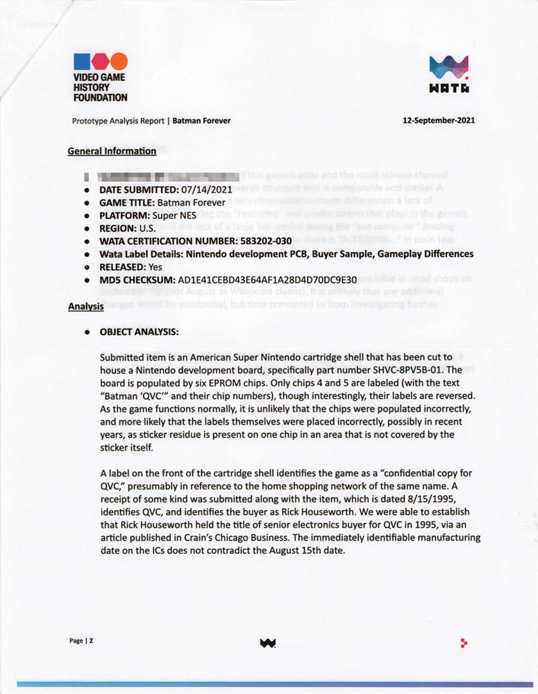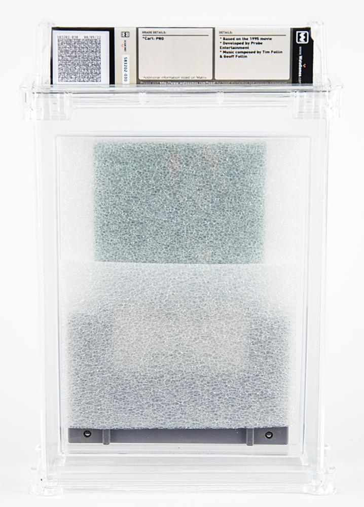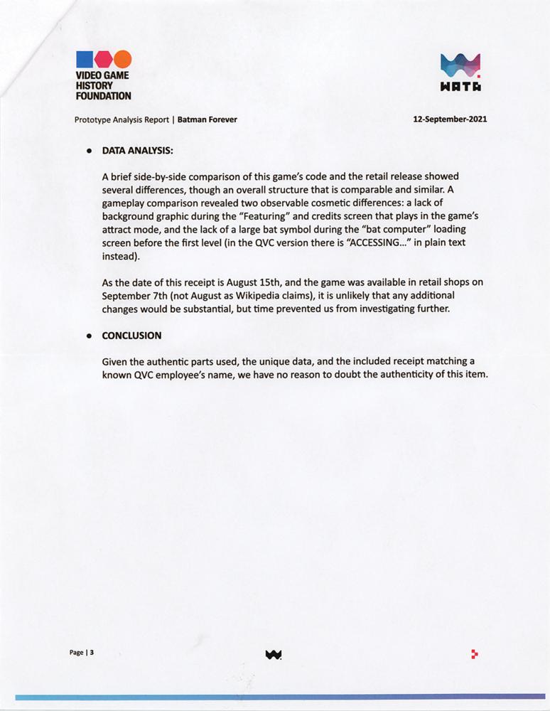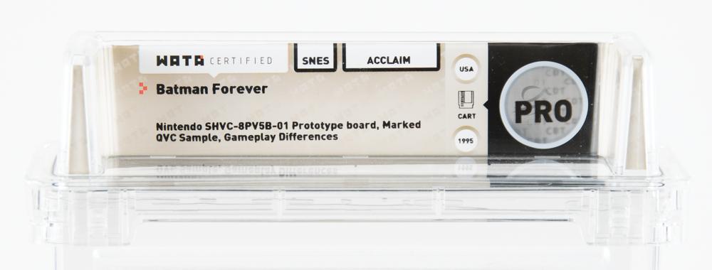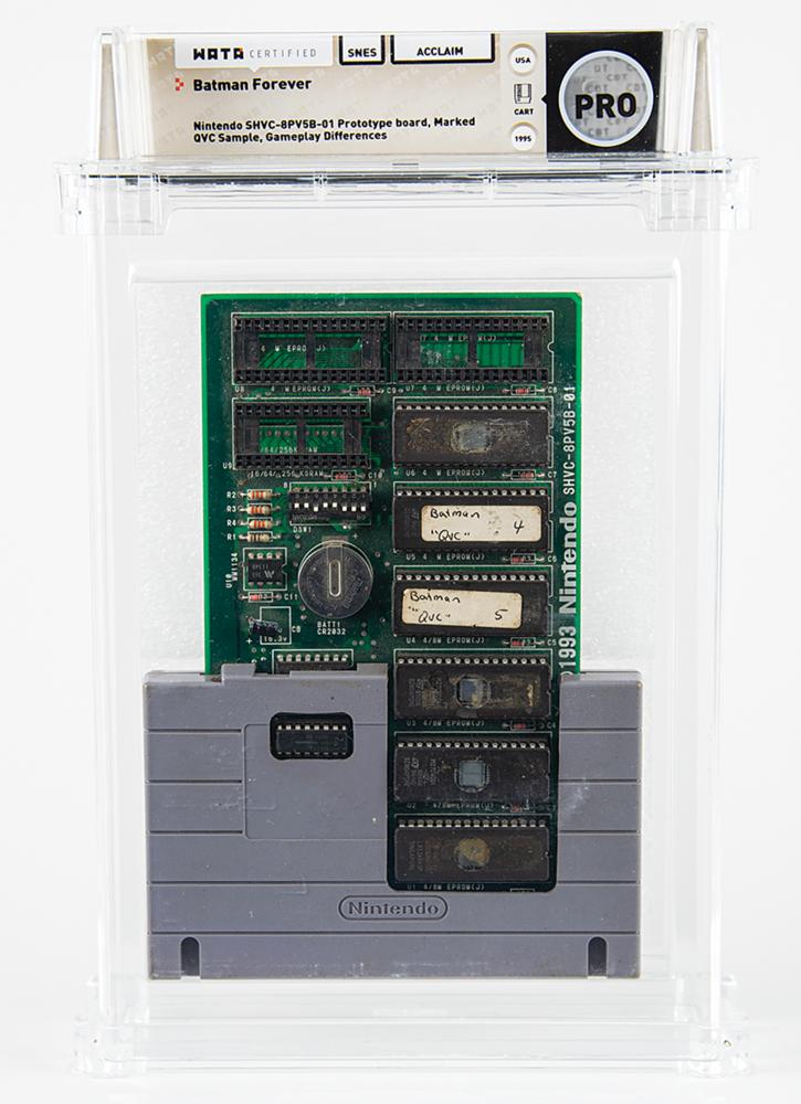 Rare ‘QVC sample’ prototype of the Super Nintendo Entertainment System (SNES) video game Batman Forever, which was released in North America in August 1995. The top of the SNES cartridge shell has been excised to house a Nintendo development board numbered “SHVC-8PV5B-01” and featuring six EPROM chips, two of which bear affixed labels annotated “Batman, ‘QVC’ 4” and “Batman, ‘QVC’ 5.” The front of the shell, which is obscured by a protective foam sheet, bears a label that identifies the game as a ‘confidential copy for QVC,’ the home shopping network; a receipt that no longer accompanies the game listed the buyer as Rick Houseworth, who held the title of senior electronics buyer for QVC in 1995. Encapsulated in a Wata certification holder, which grades the cartridge as “PRO.” Accompanied by a prototype evaluation report from Wata, which notes a contrast in gameplay from the original retail version: ‘A brief side-by-side comparison of this game’s code and the retail release showed several differences, though an overall structure is comparable and similar. A gameplay comparison revealed two observable cosmetic differences: a lack of background graphic during the ‘Featuring’ and credits screen that plays in the game’s attract mode, and the lack of a large bat symbol during the ‘bat computer’ loading screen before the first level (in the QVC version there is ‘ACCESSING?’ in plain text instead).”