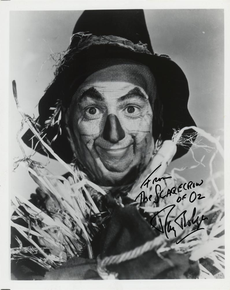 Glossy 8 x 10 close-up photo of Bolger in full Scarecrow costume and makeup for The Wizard of Oz, signed in black felt tip, "From The Scarecrow of Oz, Ray Bolger." In fine condition, with a few light surface creases, and slight brushing to the last name.