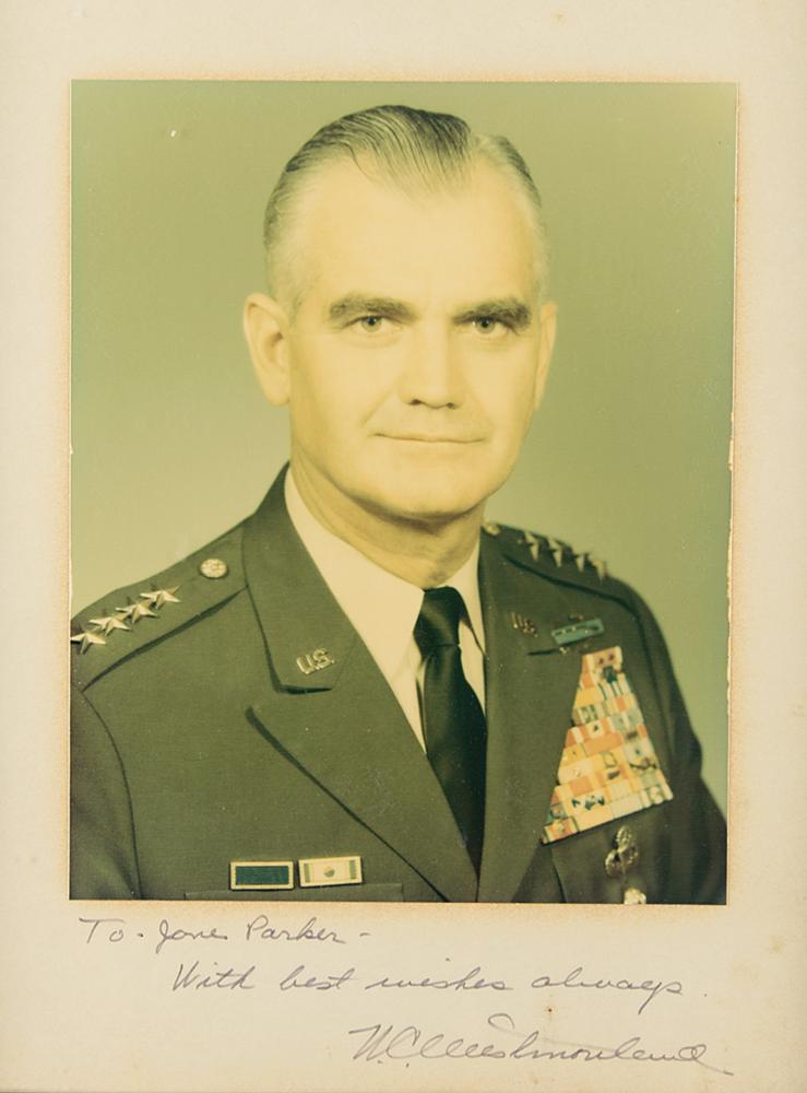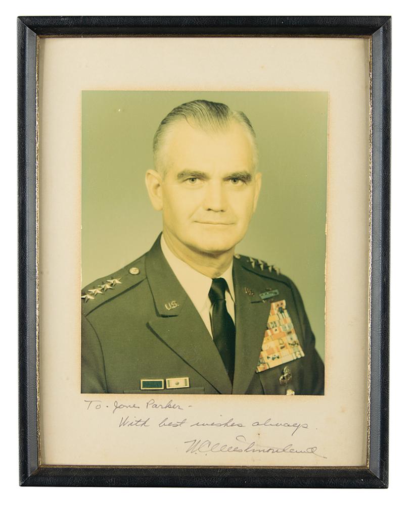 Color vintage glossy 7.25 x 9.25 photo of Westmoreland in uniform, affixed to its original 10 x 13 mount, signed and inscribed in black felt tip, "To Jane Parker, With best wishes always, W. C. Westmoreland.” In very good to fine condition, with overall crazing to the photo, and faint toning to the mount.