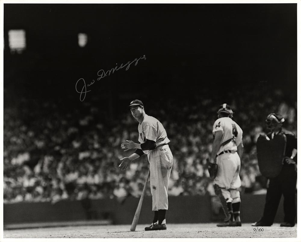 Limited edition semi-glossy 20 x 16 silver gelatin photo of New York Yankees legend Joe DiMaggio at bat and wiping his hands during a game against the Cleveland Indians, numbered 9/100, signed in silver ink. Reverse notarized by Marie Cupo. In fine condition, with a surface crease to the upper background area.