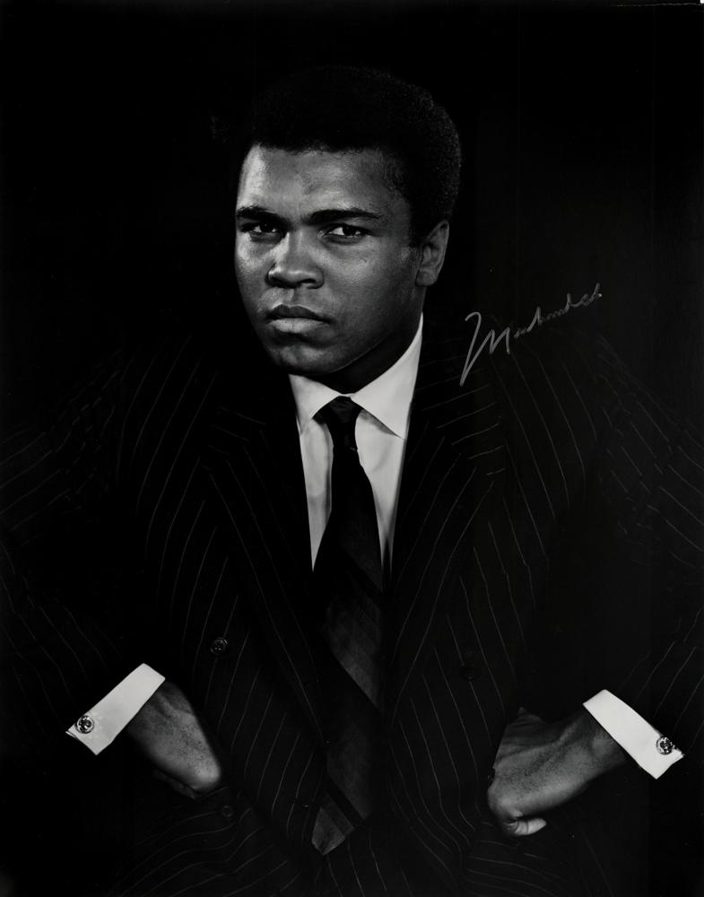 Handsome semi-glossy 15 x 19.25 silver gelatin photo of Muhammad Ali taken by renowned portraitist Yousuf Karsh in 1970, signed in silver ink, "Muhammad Ali." In fine condition, with light overall surface dimpling to the photo.