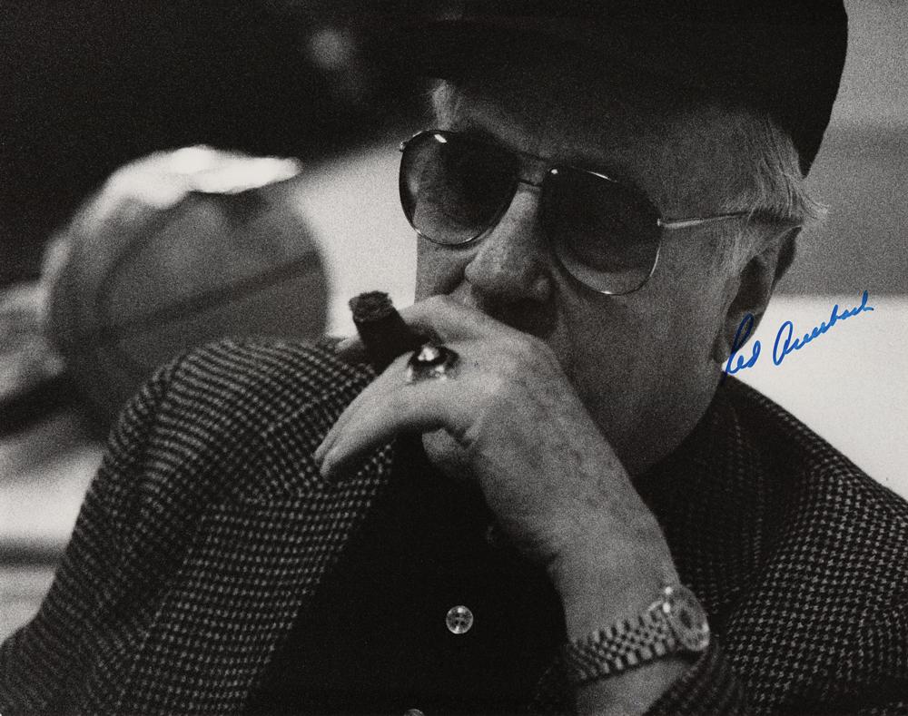 Excellent glossy 14 x 11 silver gelatin close-up photo of Red Auerbach puffing one of his trademark cigars, signed in blue felt tip. In fine condition.