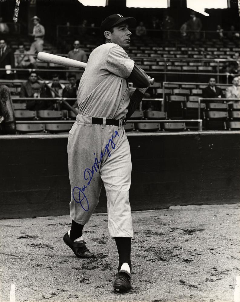Fantastic semi-glossy 16 x 20 silver gelatin photo of Joe DiMaggio taking a practice swing for the New York Yankees, signed in blue felt tip, "Joe DiMaggio." Reverse bears a 1978 Brearley Collection copyright stamp. In fine condition, with light overall rippling.