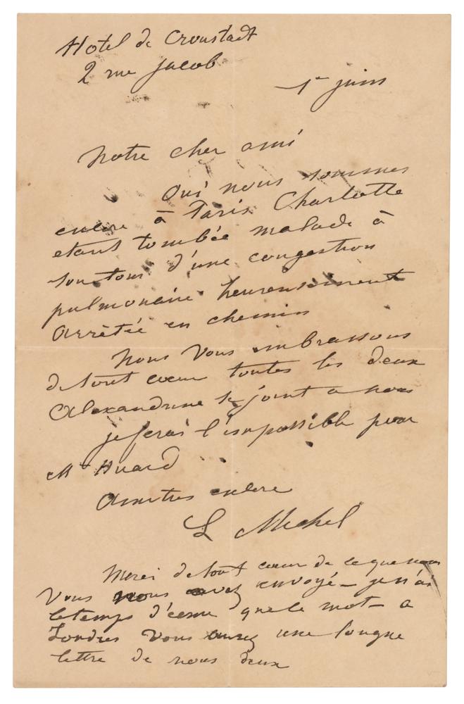 French anarchist, school teacher, and medical worker (1830-1905) known for her radical activism and admired for her association with the Paris Commune. ALS in French, signed “L. Michel,” one page, 5.25 x 8, June 1, [no year]. Untranslated handwritten letter by the celebrated anarchist. In fine condition.