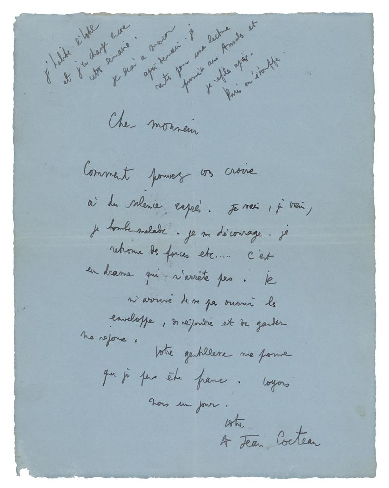 ALS in French, one page, 8.25 x 10.5, no date. Handwritten letter by Jean Cocteau, in part (translated): "How could you believe I did my fallacies on purpose. It is true that I come and I fall ill. I’m often discouraged and then I recover forces, my strength, etc. It’s a drama that never ends. It happens to me not to open an envelope or to answer and keep my answer instead of sending the letter. Your kindness tells me I can be frank. Let’s see each other one day." He adds a handwritten postscript at the top, in part: "I live in hotels and I am still moving this week. I will be in Macon the day after tomorrow...Paris asphyxiates me." In fine condition, with central vertical and horizontal folds.