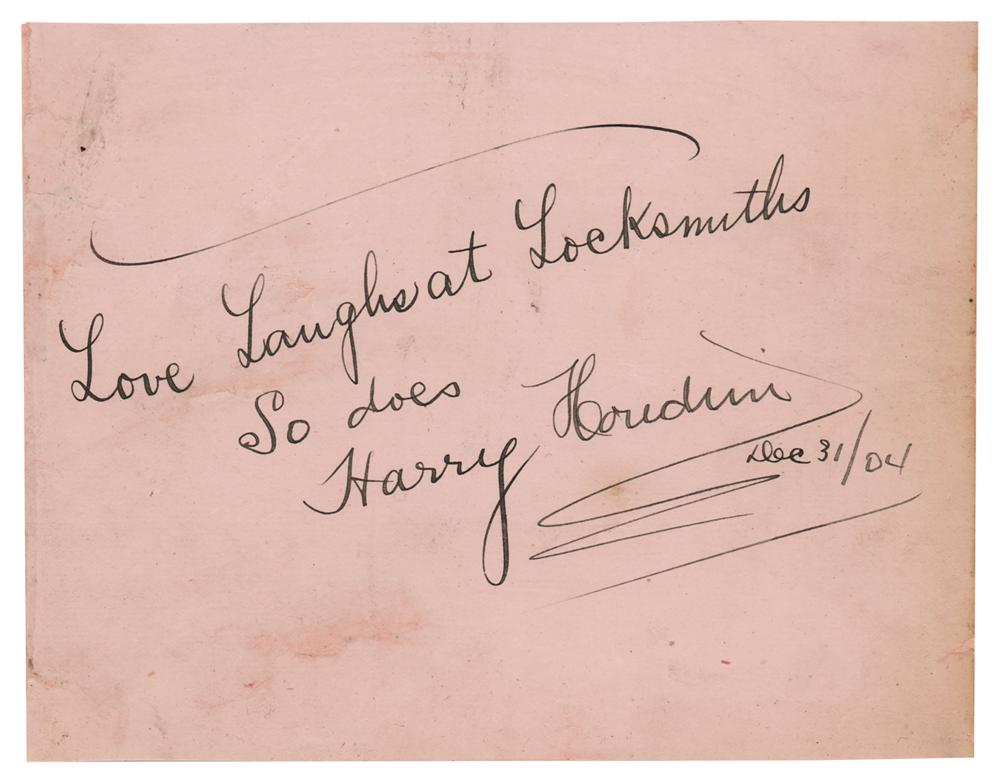 Hugely desirable vintage ink signature, "Love Laughs at Locksmiths, So does Harry Houdini, Dec. 31/04,” on a light pink 6 x 4.75 album page. In very good to fine condition, with light soiling and creasing. A superb autograph from Houdini, evoking his legendary escape acts involving handcuffs and shackles.
