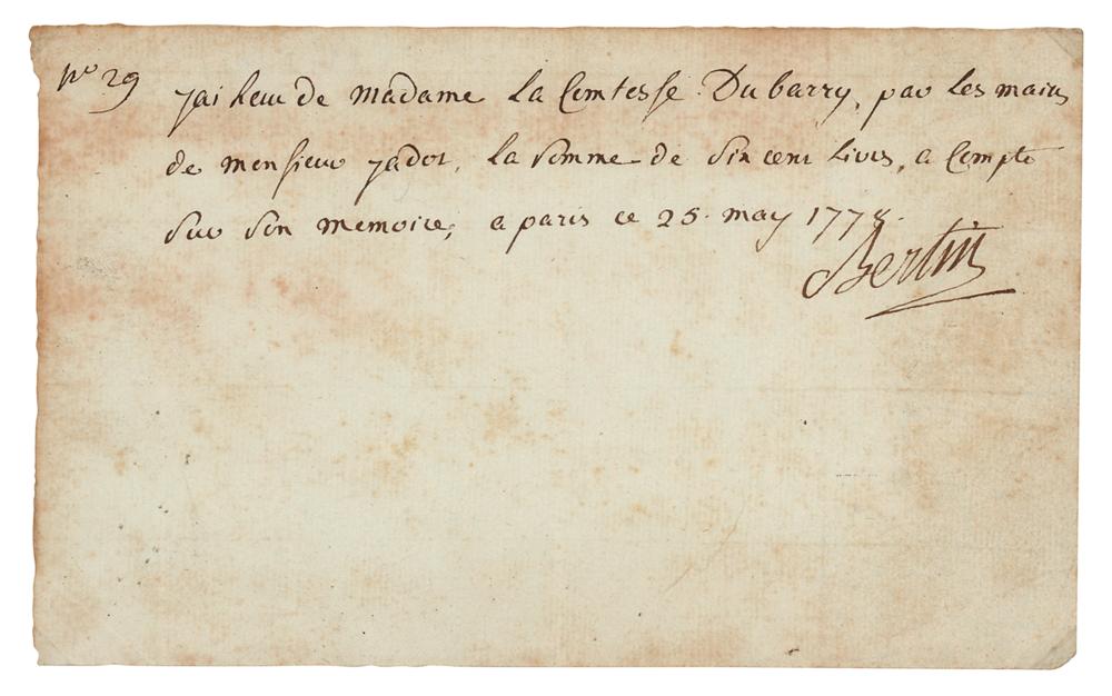 French milliner and dressmaker (1747-1813) to Queen Marie Antoinette. She was the first celebrated French fashion designer and is widely credited with having brought fashion and haute couture to the forefront of popular culture. ADS in French, signed “Bertin,” one page, 7.25 x 4.5, May 25, 1778. A handwritten receipt for the dress of Madame du Barry, the infamous mistress of King Louis XV and one of the victims of the Reign of Terror. In full (translated): "I have received from Madame la Comtesse du Barry through the hands of Mr. Gadot the sum of 600 livres as part payment for her account in Paris." In very good to fine condition, with scattered light staining. Du Barry—who was integral to Bertin's rise to fame—was still very rich after the demise of the king, and at this time 600 livres was a small fortune. An exceptional association piece from a foundational figure in this history of fashion, whose autographs are extremely rare.