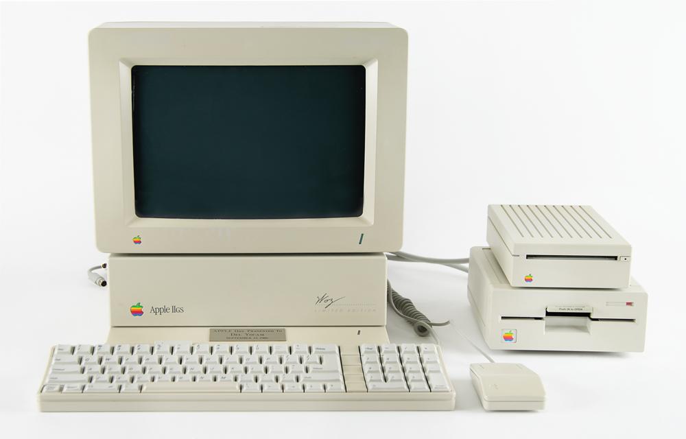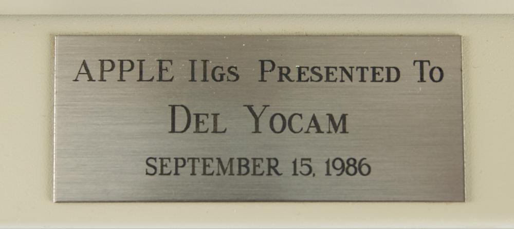 Desirable Apple IIGS 'Woz Edition' computer personally-owned by Apple executive Del Yocam, who was the executive vice president and general manager of the Apple II group (1983-1985), Apple's first chief operating officer (COO) (1986-1988), and president of Apple Pacific (1989). This example of the Apple IIGS has the facsimile signature of Steve Wozniak imprinted on the faceplate, with "Limited Edition" below; to celebrate the 10th anniversary of the Apple II series' development, the first 50,000 Apple IIGSs manufactured featured this special faceplate. On the panel below is an engraved presentation plaque: "Apple IIGS Presented To Del Yocam, September 15, 1986," the day that the Apple IIGS was introduced. The Apple Computer, Inc. manufacturer's label applied to the bottom identifies the unit as "Model No. A2S6000, Serial No. A2S2-E70638YA2S6000." Additionally includes all accessories and peripherals required for operation, including an Apple IIGS monitor stand, AppleColor RGB Monitor, Apple IIGS Keyboard, Apple Desktop Mouse, Apple 3.5″ Disk Drive, Apple 5.25″ Disk Drive, and affiliated cords and cables. In fine cosmetic condition; the computer boots and appears to be fully functional, but needs a startup disk.