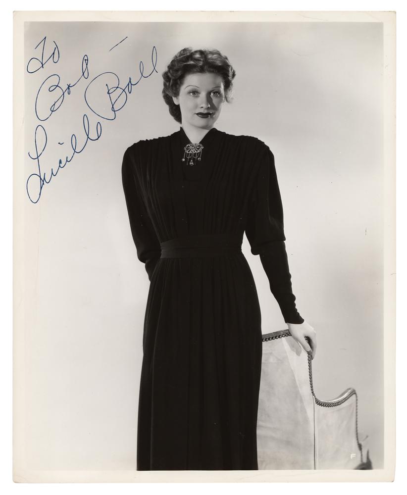 Vintage glossy 8 x 10 1938 RKO publicity photo by Ernest A. Bachrach, picturing a young Ball in an early and elegant pose, signed and inscribed in fountain pen, "To Bob—Lucille Ball." Reverse bears an RKO and Bachrach copyright stamp. In very good to fine condition, with scattered small creases, and a vertical crease just touching the first letter of the signature. A lovely and uncommonly early example of the future television superstar.