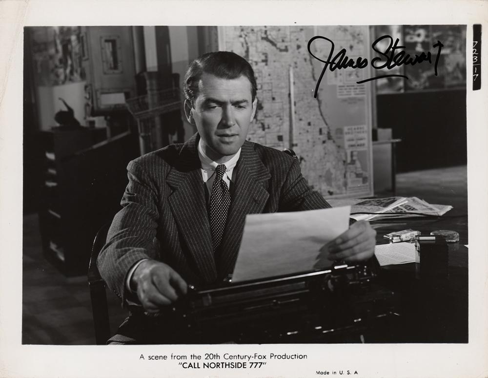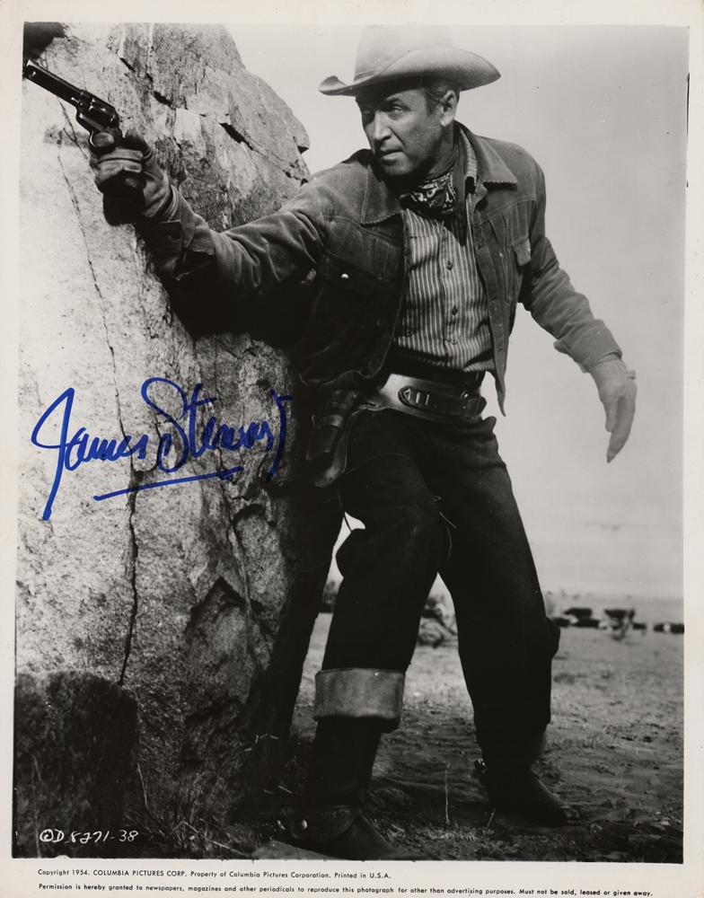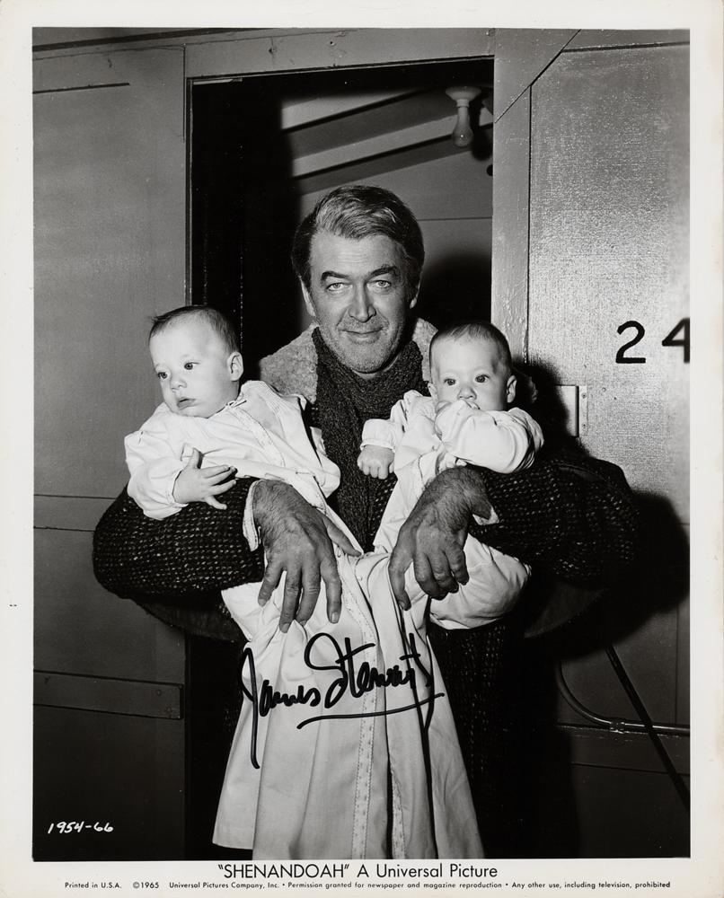 Three glossy publicity photos signed in blue or black felt tip by James Stewart: an 8 x 10 photo of Stewart as Will Lockhart in the 1955 Western film The Man from Laramie; a 10.25 x 8 photo of Stewart as P.J. McNeal in the 1948 drama Call Northside 777; and an 8.25 x 10 photo of Stewart as Charlie Anderson holding two babies during the production of the 1965 Western film Shenandoah. In overall fine condition, with some light creasing, mainly to borders.