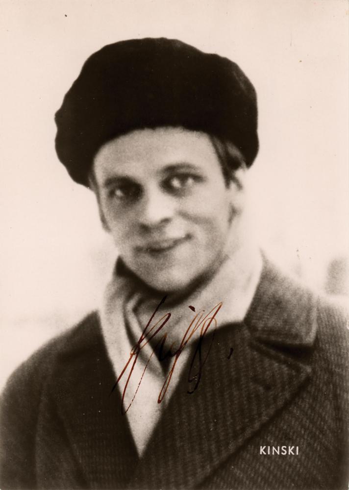 Vintage glossy 4 x 5.75 postcard photo of controversial actor Klaus Kinski pictured early into his career, signed in fountain pen. In fine condition.