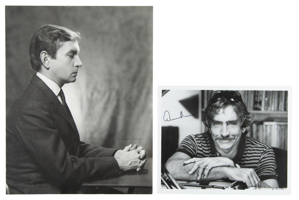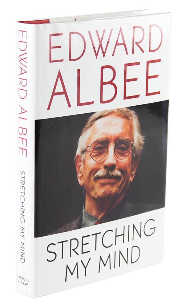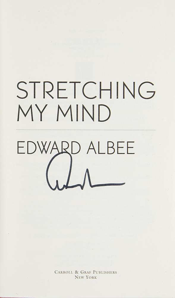 Three items signed in ink or felt tip by award-winning playwright Edward Albee: an attractive matte-finish 11 x 14 portrait photo of Albee in profile by the Pach Brothers studio (blindstamp in lower right), an image used as Albee’s official portrait for the American Academy of Arts and Letters; a glossy 10 x 8 photo of Albee smiling in a front-facing half-length pose; and a 2005 first Carroll & Graf edition of Albee’s Stretching My Mind, hardcover with dust jacket, signed on the book’s title page. In overall fine condition.
