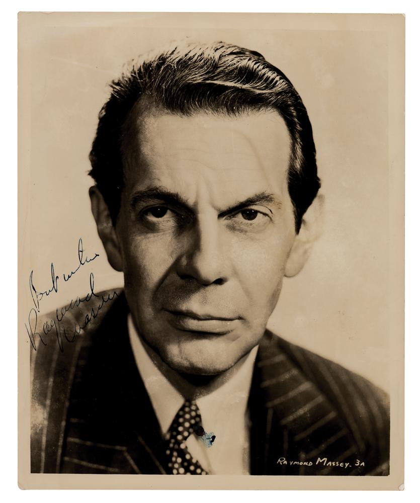 Vintage glossy 8 x 10 photo of the Oscar-nominated actor in an up-close pose, signed in fountain pen, "Best wishes, Raymond Massey." In very good to fine condition, with scattered light creasing. An appealing signed photo of one of the few actors to play both Abraham Lincoln and Sherlock Holmes.