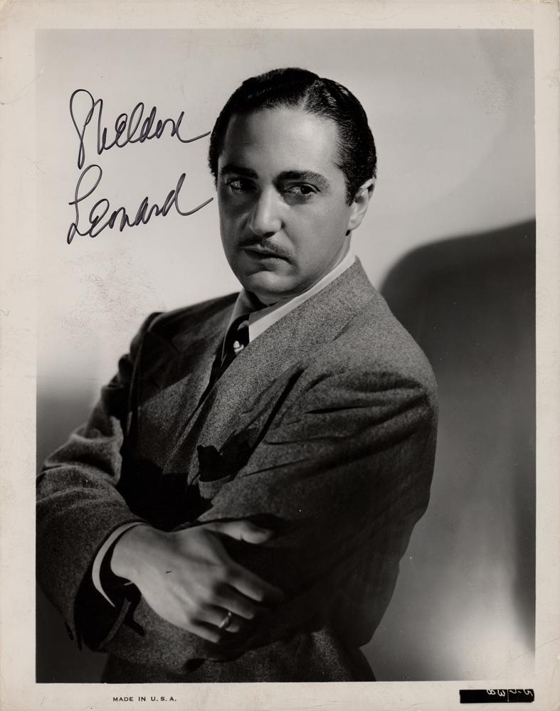 Glossy 8 x 10 studio photo of Sheldon Leonard with his arms crossed in a handsome half-length pose, signed in black felt tip. In very good to fine condition, with scattered light creasing. Leonard was one of vintage Hollywood's most dependable actors, who starred in classic films like It's a Wonderful Life, To Have and Have Not, and Guys and Dolls, as well as in enduring film noirs such as Decoy and Another Thin Man.