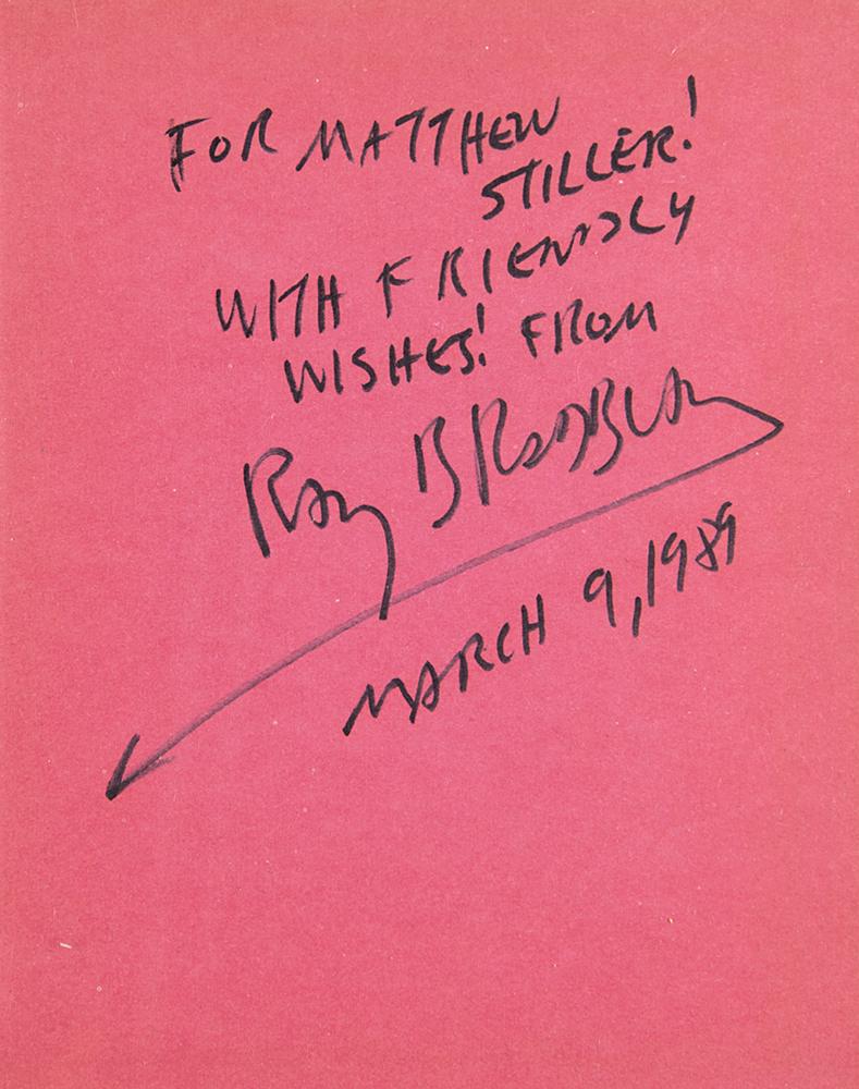 Switch on the Night by Ray Bradbury. Library edition. NY: Pantheon Books, 1955. Textured pictorial hardcover, 6.5 x 8.5. Signed and inscribed on the first free end page in black felt tip, “For Matthew Stiller! With friendly wishes from Ray Bradbury, March 9, 1989.”