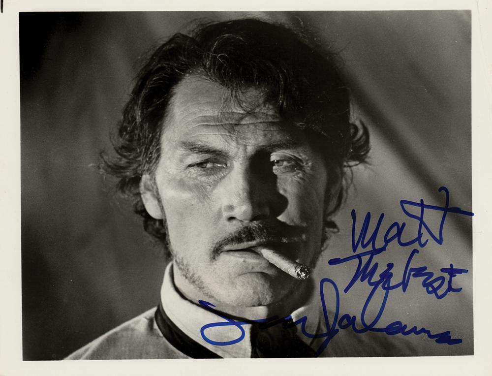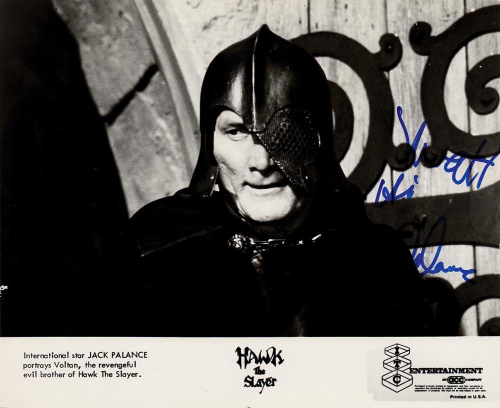 Two glossy photos, both signed and inscribed in blue felt tip by Oscar-winning actor Jack Palance: a 9.25 x 7 photo of Palance as Parson Josiah Galt from the 1969 Western film The Desperados, and a 9.75 x 8 publicity photo of Palance as Voltan, Hawk's evil brother, from the 1980 sword and sorcery adventure film Hawk the Slayer. In overall fine condition.