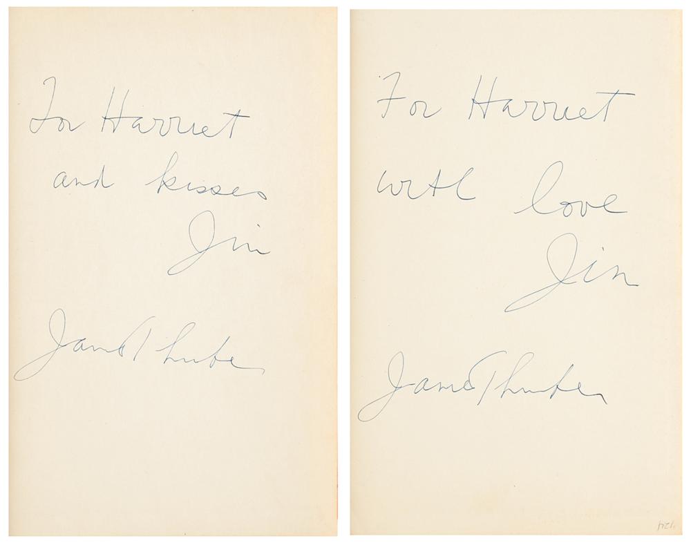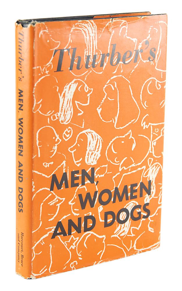 Twice-signed book: Thurber's Men, Women and Dogs. First edition. NY: Harcourt, Brace and Company, 1943. Hardcover with dust jacket, 6.5 x 9.5, 199 pages. Signed and inscribed on the first free end page in black ink, "For Harriet and Kisses, Jim, James Thurber," who signs again upside down on the rear free end page, "For Harriet, with love, Jim, James Thurber." In fine condition, with light wear to the dust jacket. "Kisses" is the name of the recipient's pet dog and the reason for Thurber's second inverted autograph, according to the consignor, was due to Thurber's worsening sympathetic ophthalmia, a condition in which an undamaged eye can react to an injured one because of the body’s immune response; the famed cartoonist of The New Yorker lost his left eye at the age of six when his brother shot him an arrow during a game of William Tell.