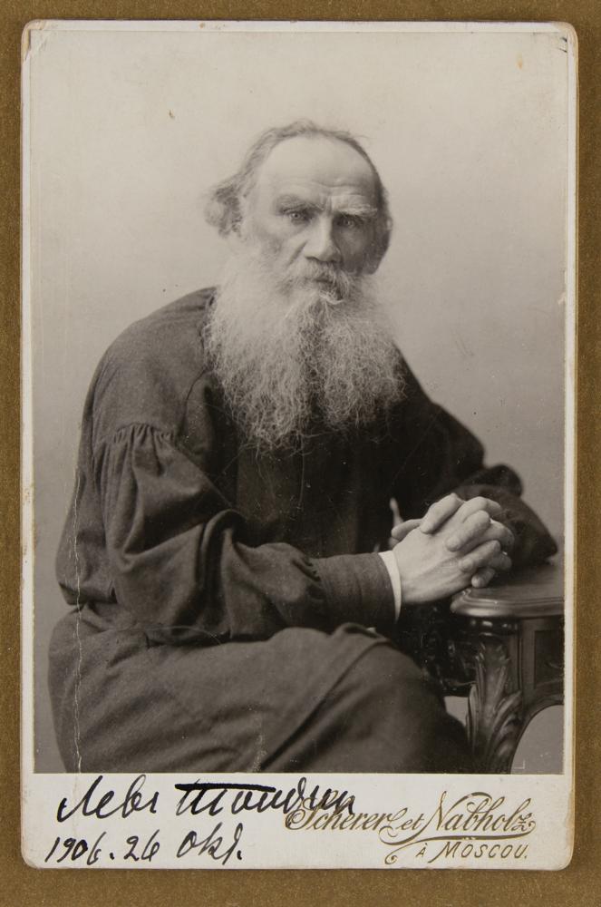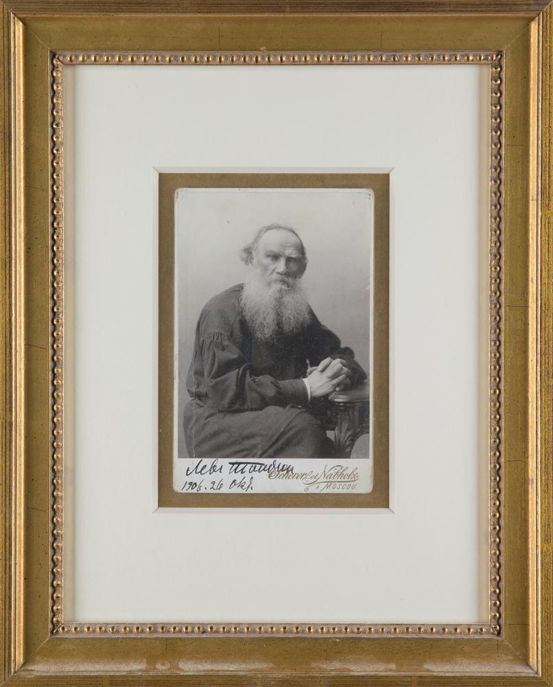 Scarce and immensely desirable 4.25 x 6.5 Russian cabinet photo of Tolstoy dressed in a traditional belted tunic and seated in a half-length pose with his hands clasped together, signed in the lower border in black ink by Tolstoy, who adds a date of October 26, 1906. Published by Scherer et Nabholz of Moscow in the early 1890s. Handsomely matted and framed to an overall size of 11.5 x 14.25. In very good to fine condition, with a vertical crease along the left side, just passing through the first letter of the signature. A tremendous portrait of the revered Russian novelist—this particular Scherer et Nabholz cabinet photo, desirable in its own right, is rarely signed by its influential subject.