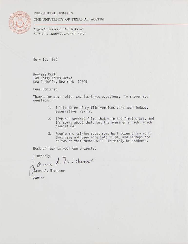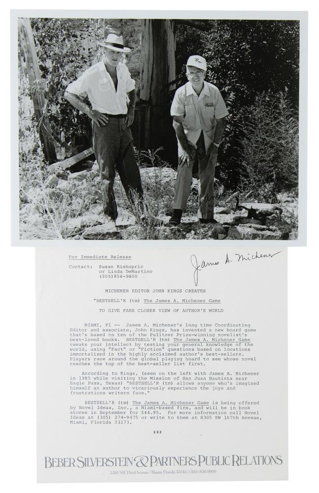 Three items signed in black ink by James Michener: a glossy 10 x 8 photo of Michener standing next to his editor John Kings; an 8.5 x 8 Beber Silverstein & Partners press caption sheet (affixed to the reverse of the aforesaid photo) promoting the board game Bestsell’r: The James A. Michener Game; and a TLS, one page, 8.5 x 11, University of Texas (Austin) letterhead, July 15, 1986, which finds Michener answering three questions about his works being made into films, in part: “I like three of my films very much indeed. Superlative, really?I’ve had several films that were not first class, and I’m sorry about that, but the average is high.” In overall fine condition.