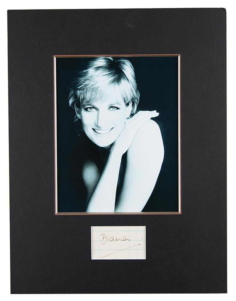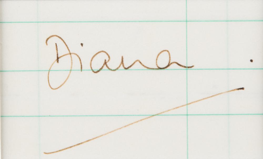 Appealing ink signature, "Diana,” on a lined off-white 3.5 x 2 slip, handsomely matted with a portrait to an overall size of 13.75 x 18. In fine condition.
