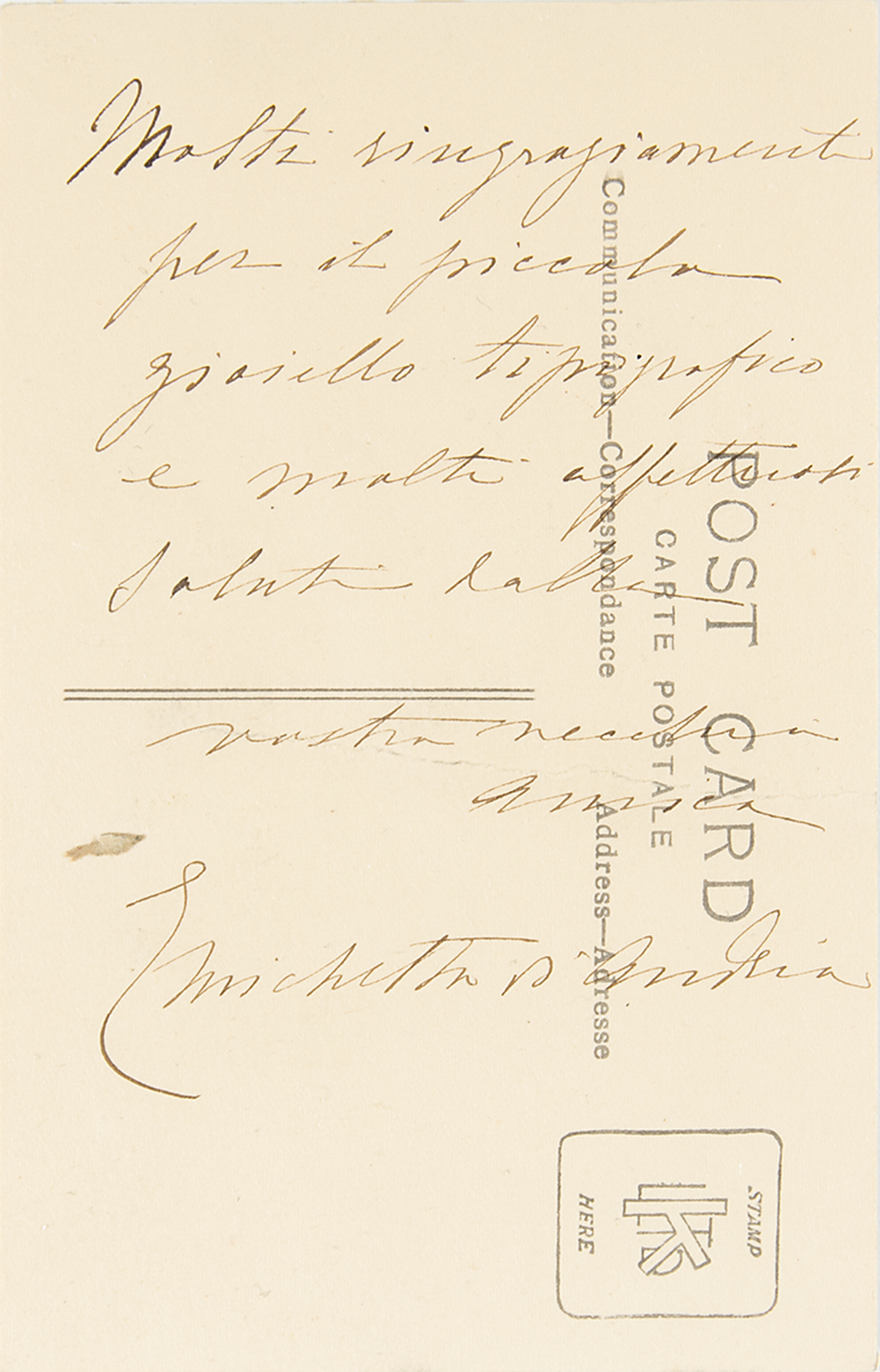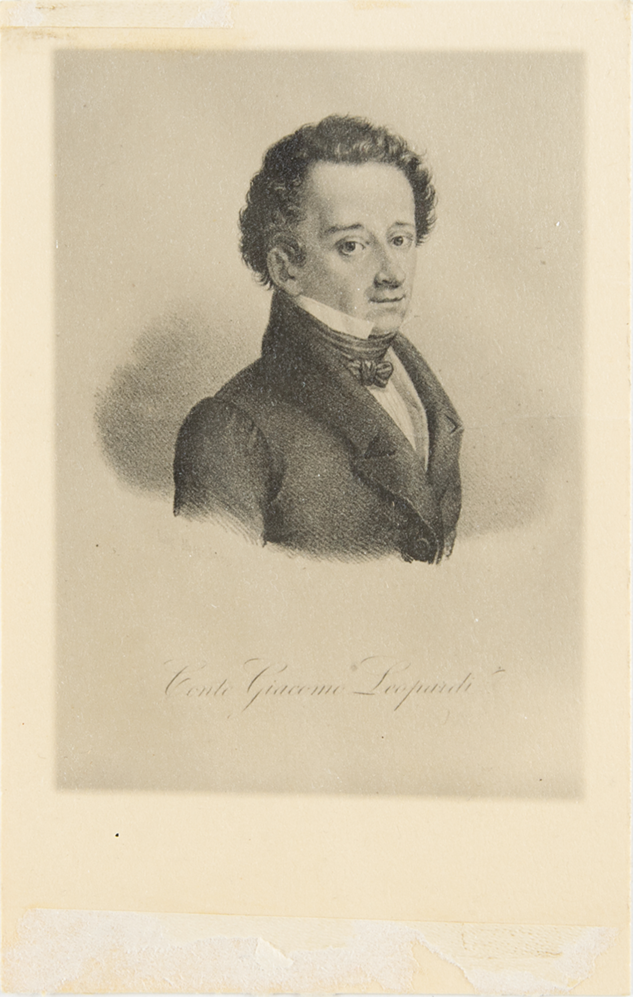 Matte-finish 3.25 x 5.25 postcard photograph of an engraving of Italian poet Giacomo Leopardi, with an untranslated handwritten note on the reverse in an unknown hand. In very good condition, with mounting remnants to edges and a central horizontal crease.