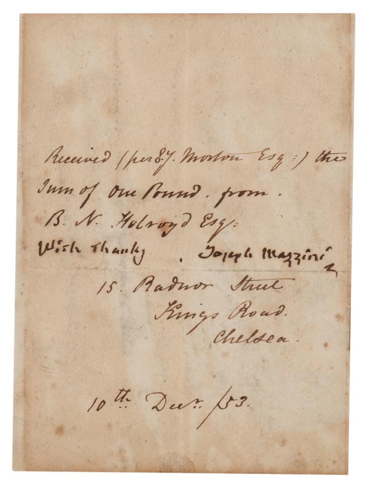Italian patriot (1805-1872) who dedicated his life, much of which was spent in exile, to uniting his country under a republic. Manuscript DS, signed “With thanks, Joseph Mazzini,” one page, 3.75 x 5.25, December 10, 1853. Pay receipt issued in Chelsea, England, in full: "Received (per E. Y. Morton Esq.) the sum of one pound from B. N. Holroyd Esq." In very good to fine condition, with light scattered staining and a label affixed to the reverse. An interesting English variant of Mazzini's signature.