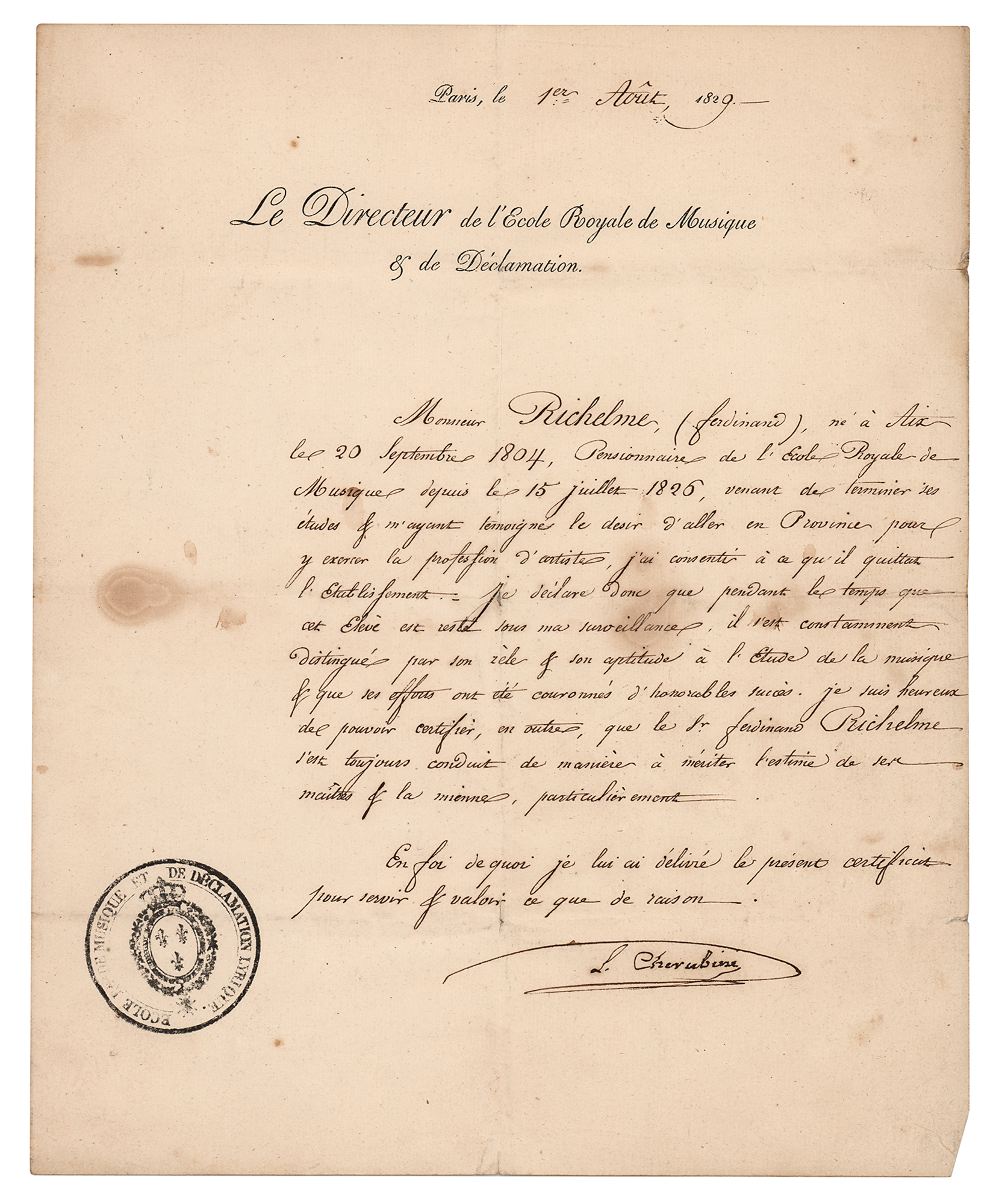 Italian composer (1760-1842) known for his operas and sacred music; Beethoven regarded him as the greatest of his contemporaries. LS in French, signed “L. Cherubini,” one page, 8 x 10, August 1, 1829. Untranslated letter signed by Cherubini as director of l'Ecole Royale de Musique. In fine condition, with light scattered staining and a few nicks to edges.
