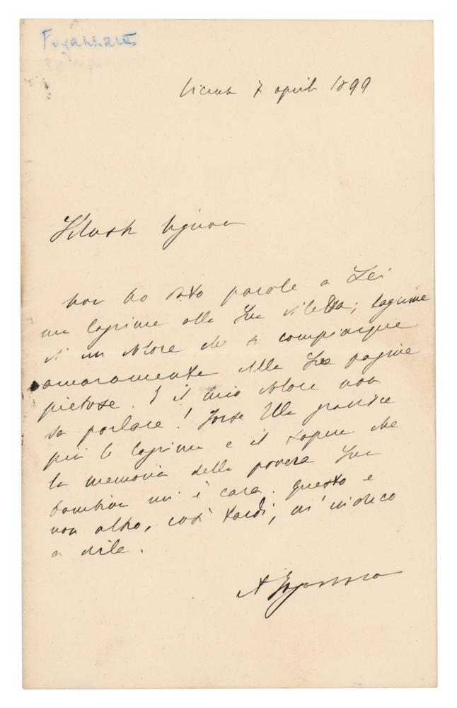 Italian novelist (1842-1911) known as part of the scapigliatura movement. ALS in Italian, signed “A. Fogazzaro,” one page, 4.25 x 7, April 7, 1899. Untranslated handwritten letter by the esteemed novelist. In fine condition.
