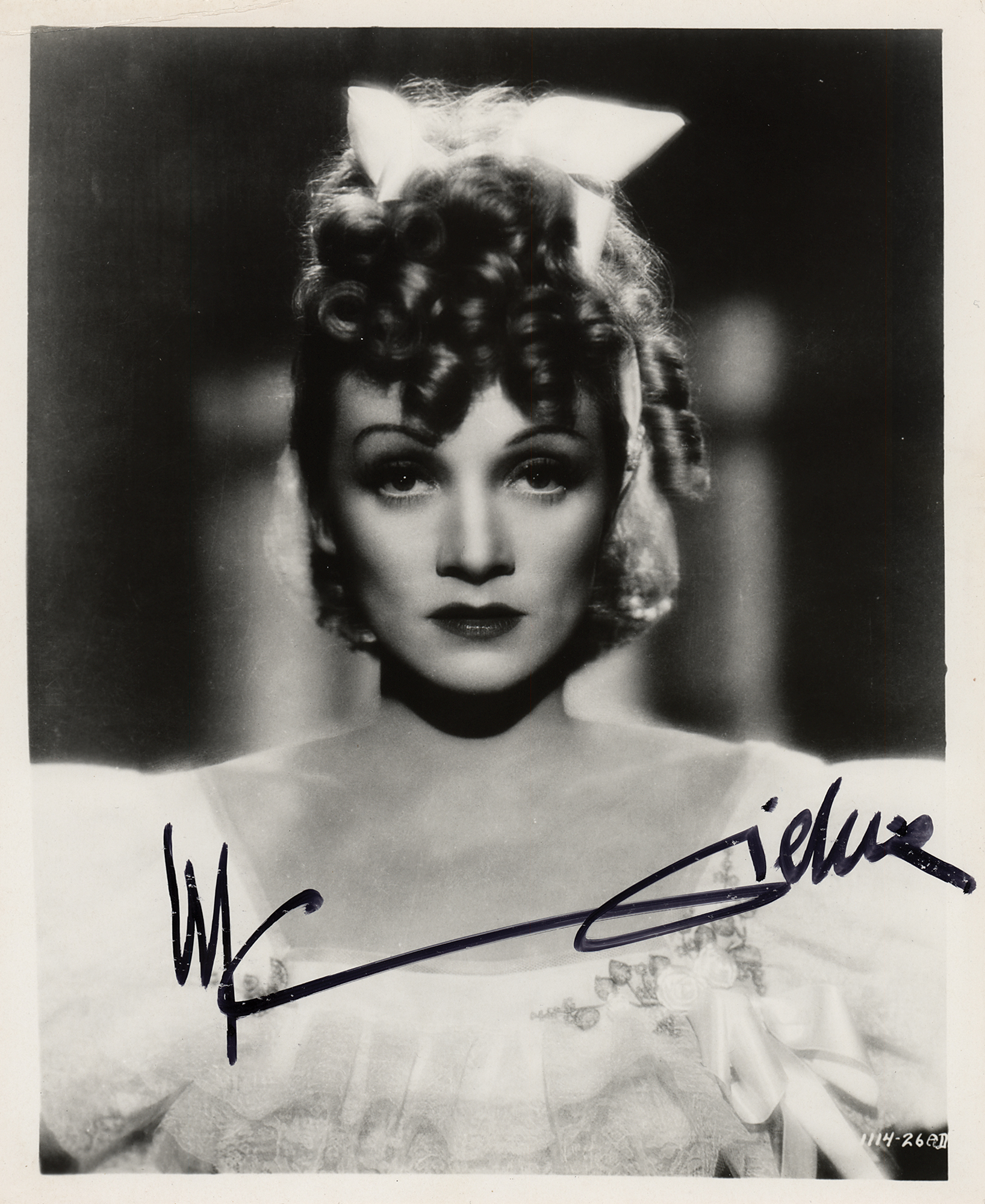 Glossy 8 x 10 photo of Marlene Dietrich in a head-and-shoulders pose, signed in thick black felt tip. In fine condition, with slight rubbing to ink and a bit of emulsion irregularity to the right side.