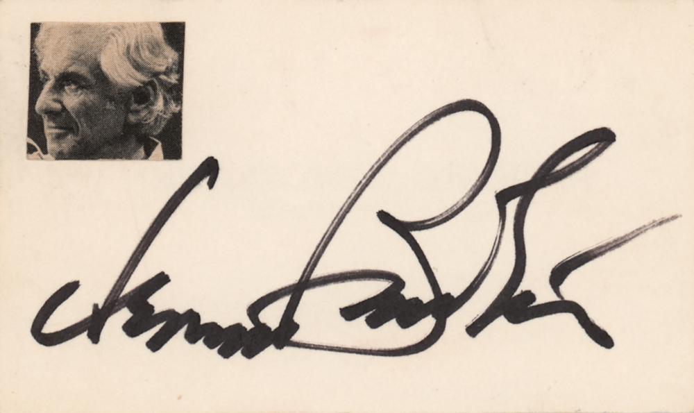 Felt tip signature, "Leonard Bernstein,” on a white 3.25 x 2 card bearing a small affixed portrait. In fine condition.