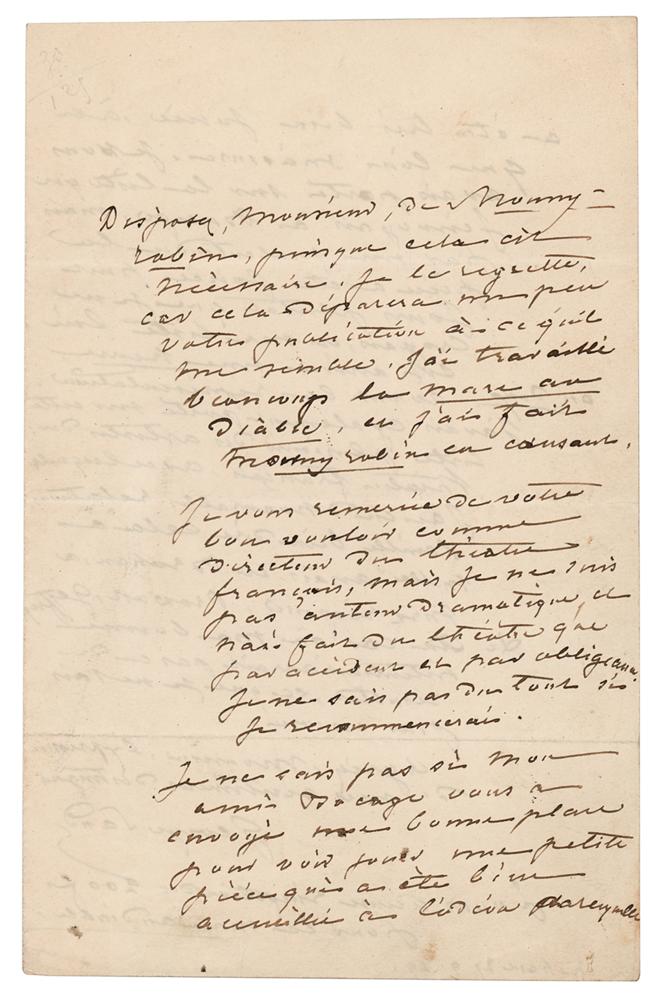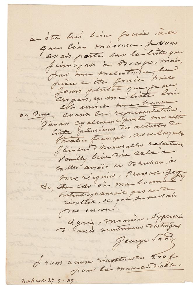 ALS in French, one page both sides, 5.25 x 8.25, September 27, 1849. Handwritten letter referring to her novel "La Mare au Diable" and work in the theater, in part (translated): "I worked a lot on La Mare au Diable?I thank you for your kindness as director of the Theatre Francais, but I am not a theater writer and I only did theater by accident and kindness. I do not know at all whether I will do it again. I do not know whether my friend Bocage sent you my good seat for you to see my small play, which has been well received. According to what I am told, it was very well played. I had put your name on the list that I sent Bocage, but, due to a misunderstanding, the play was played eight days sooner than I thought, and my list reached him one or two hours before the performance. I had also included in that list several of the Theatre Francais artists with whom I have had honorable relationships?I hereby acknowledge receipt of the 200 francs for La Mare au Diable." In fine condition.