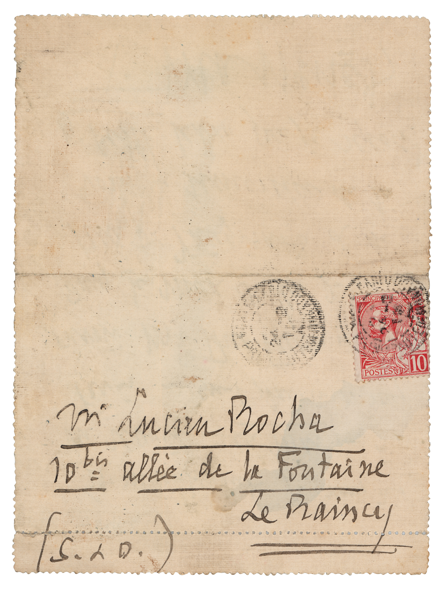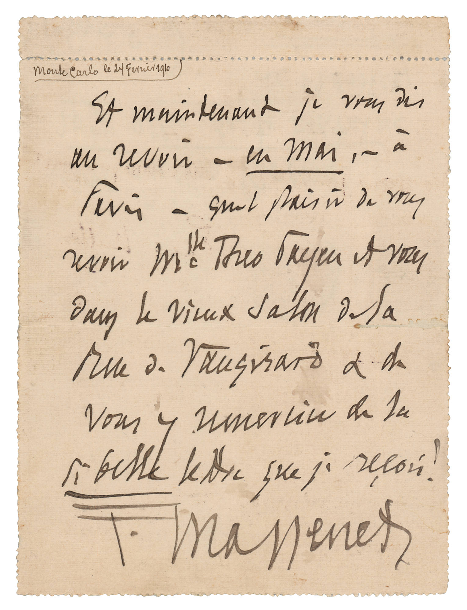 ALS in French, signed “J. Massenet,” one page, 4.25 x 5.75, February 24, 1910. Untranslated handwritten letter to Lucien Rocha, addressed on the reverse by the celebrated composer. In fine condition, with light soiling.