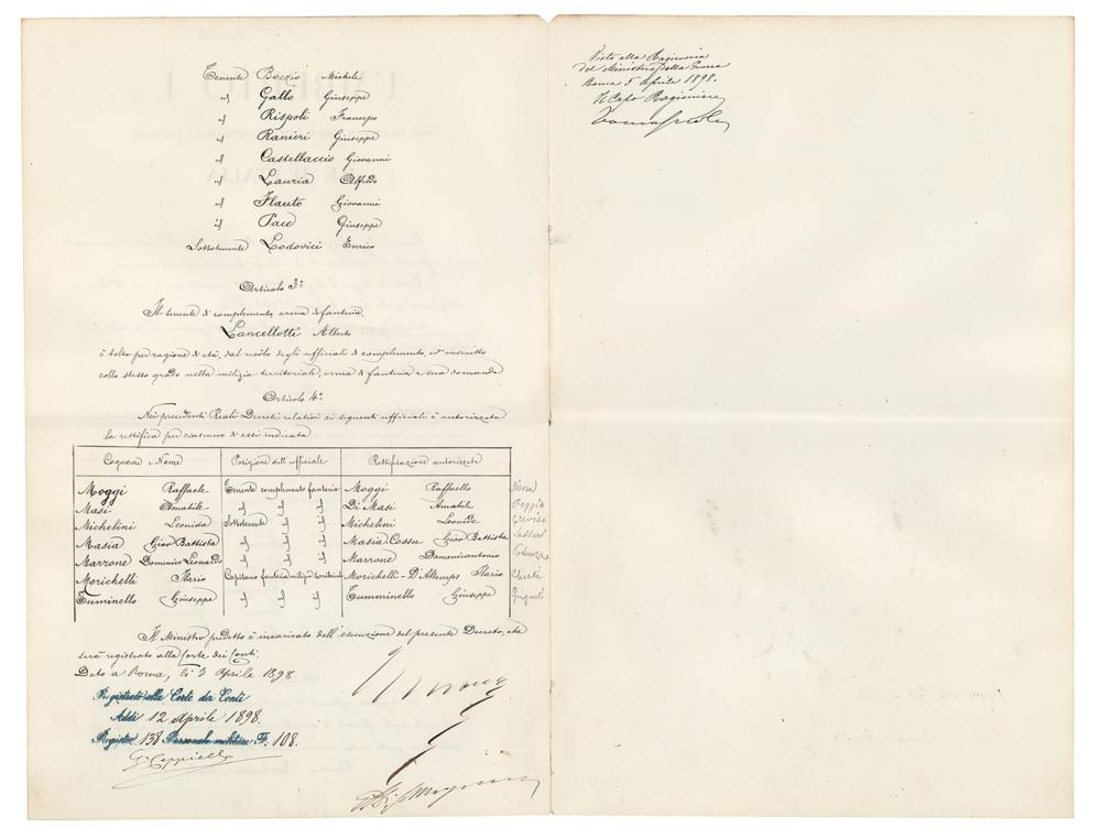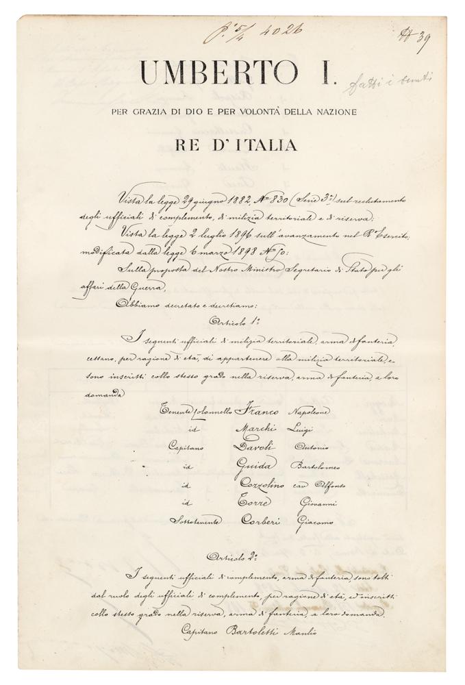 King of Italy (1844-1900) who reigned from 1878 until his assassination; he was the only Italian king to be assassinated in modern times. Manuscript DS in Italian, signed “Umberto,” one page both sides, 9.75 x 14.75, April 3, 1898. Untranslated official order signed by Umberto I as King of Italy. In fine condition.