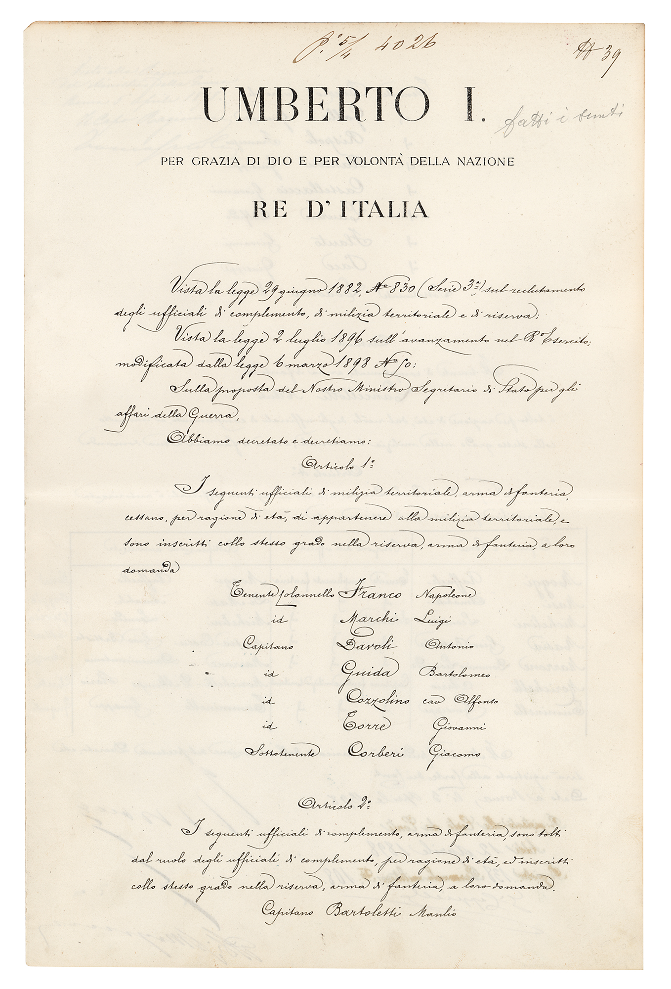 King of Italy (1844-1900) who reigned from 1878 until his assassination; he was the only Italian king to be assassinated in modern times. Manuscript DS in Italian, signed “Umberto,” one page both sides, 9.75 x 14.75, April 3, 1898. Untranslated official order signed by Umberto I as King of Italy. In fine condition.