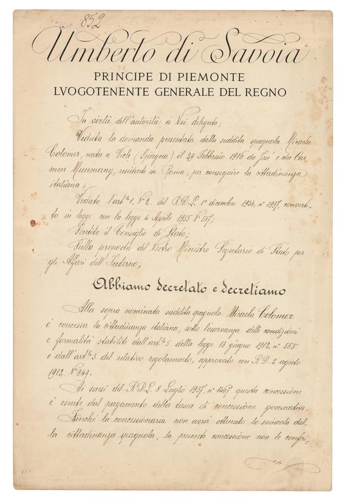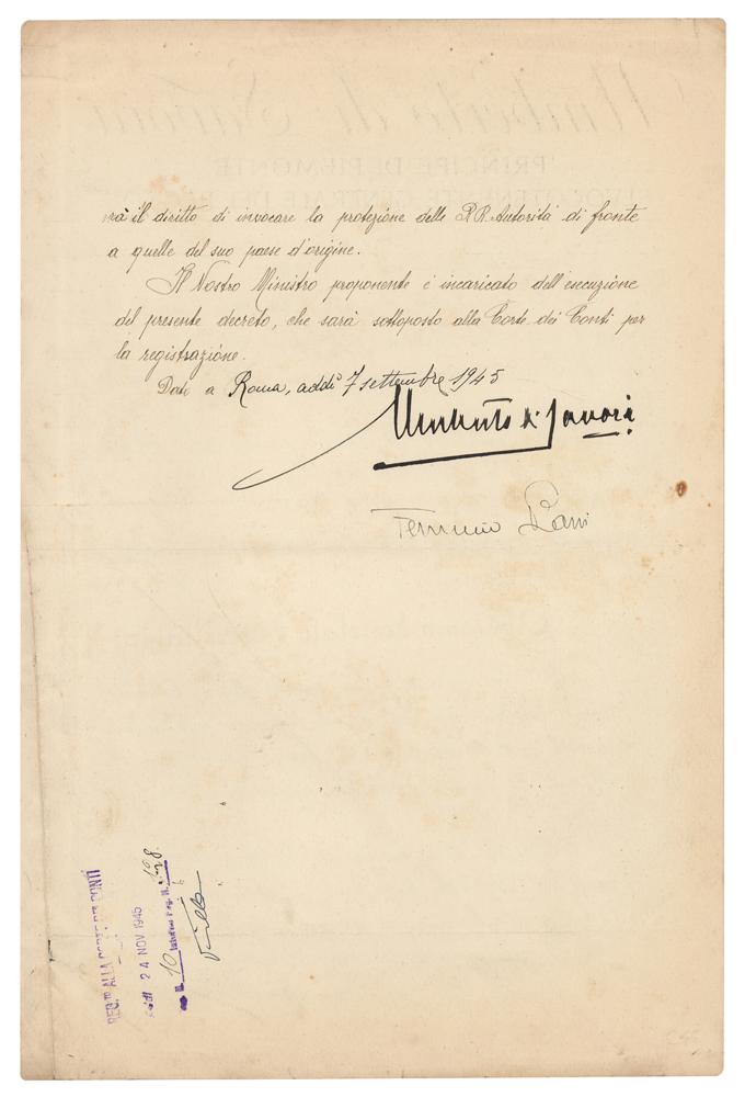 Last king of Italy (1904-1983) who spent the last 37 years of his life in exile. Manuscript DS in Italian, signed “Umberto di Savoia,” one page both sides, 9.5 x 14.25, September 7, 1945. Untranslated official document boldly signed at the conclusion by Umberto II. In fine condition, with light scattered foxing and creasing.