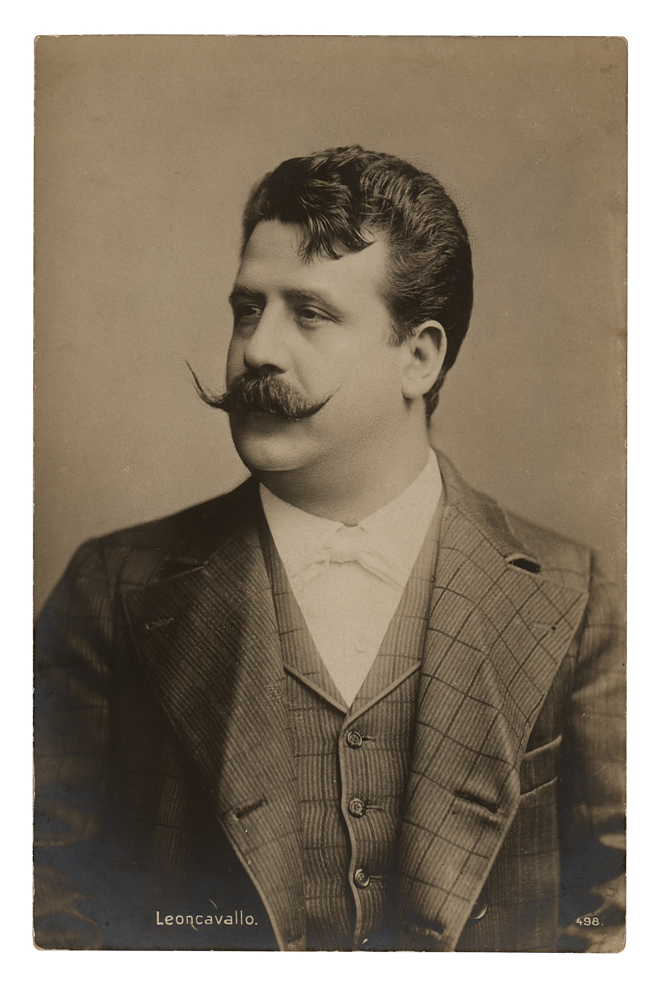 Italian composer (1857-1919) best known for his operas, particularly the beloved repertoire staple 'Pagliacci.' Original vintage matte-finish 3.5 x 5.5 postcard photograph of Ruggero Leoncavallo in a bust-length pose, showing off his waxed handlebar mustache. In fine condition.