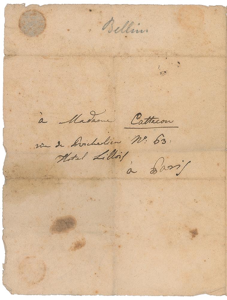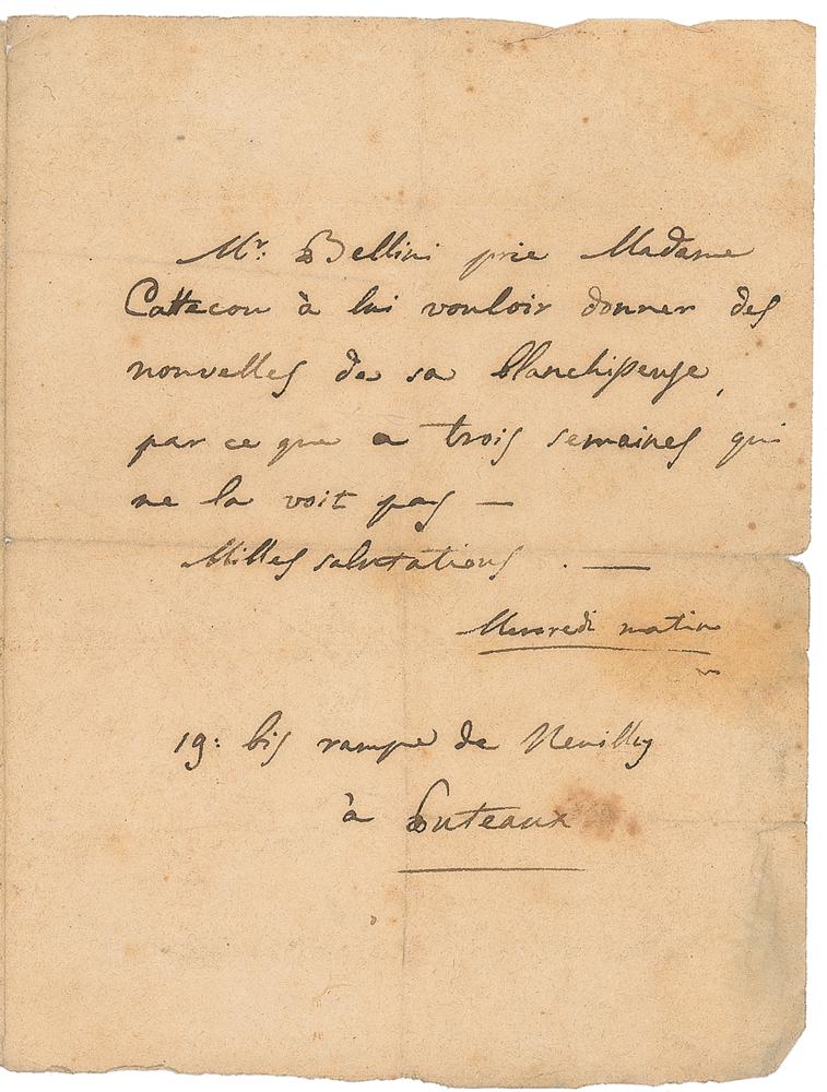 Italian opera composer (1801-1835) known for his extremely long, flowing melodic lines. Third-person ALS in French signed within the text, "Mr. Bellini," one page, 4 x 5.25, no date but circa mid-1830s. Untranslated letter to a woman at the Paris Hotel Lillois in search of his missing washer-woman. In very good condition, with central vertical and horizontal folds, light overall wrinkling, and scattered dampstaining. Accompanied by a full letter of authenticity from PSA/DNA.