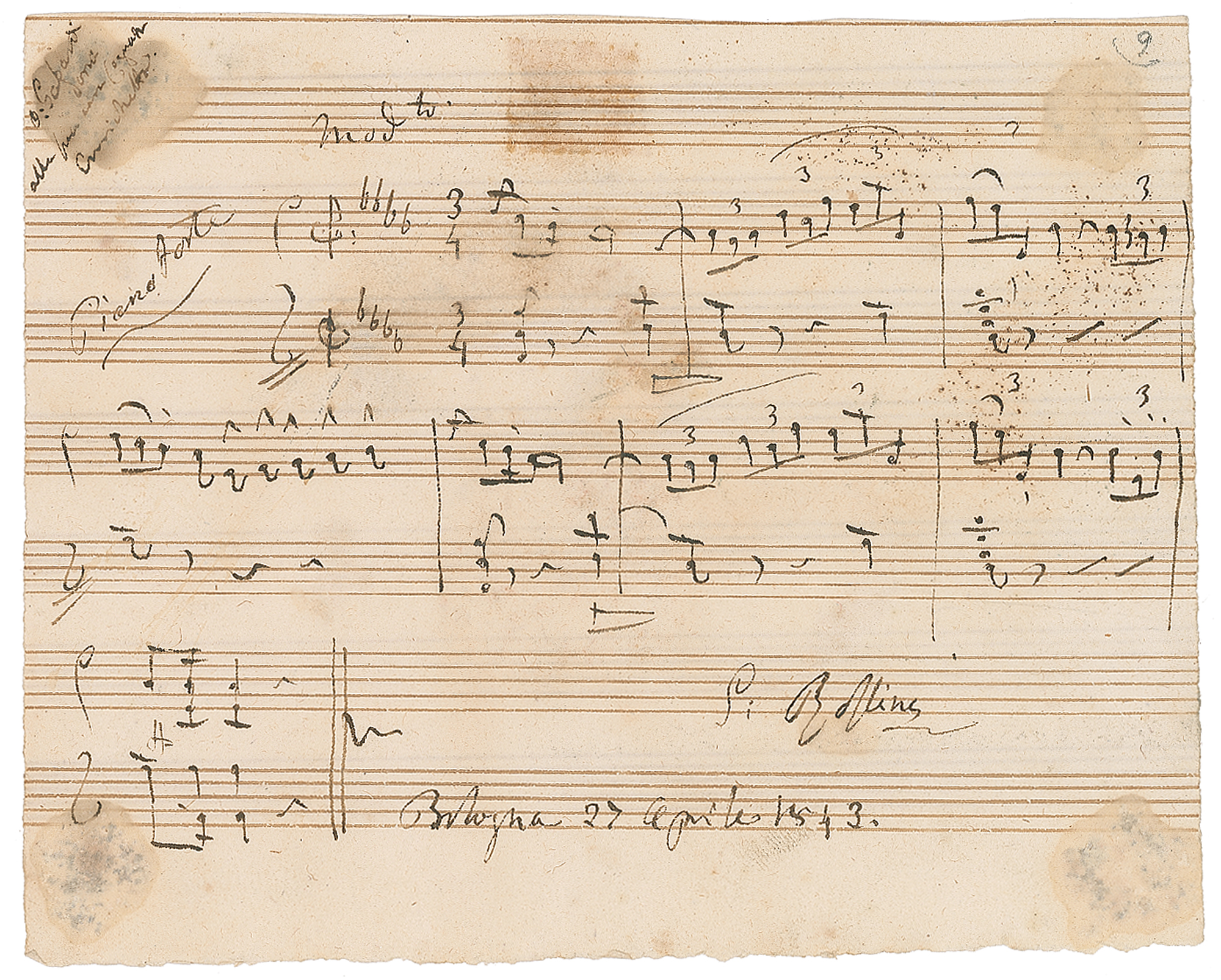 Scarce AMQS on an off-white 6.25 x 5 sheet, signed and dated at the conclusion in ink, "G. Rossini, Bologna, 27 Aprile 1843." Rossini pens eight bars of music for solo piano, marked, "Pianoforte." In very good to fine condition, with show-through from several mounting traces on the reverse. Accompanied by a full letter of authenticity from PSA/DNA.