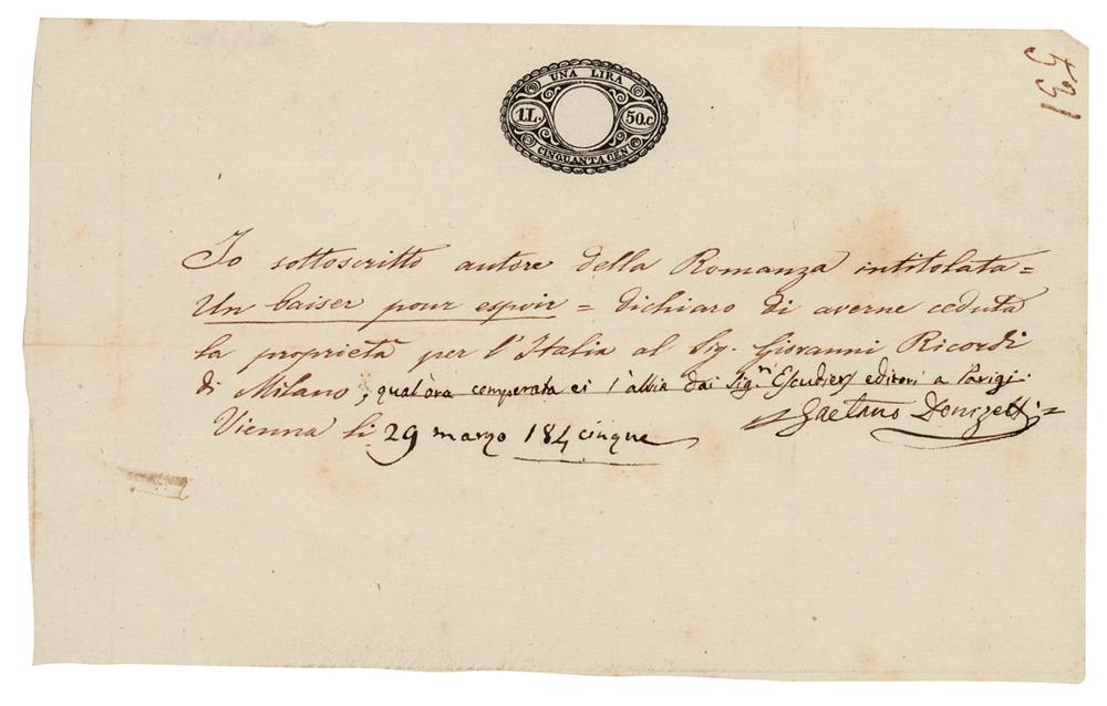 Italian composer (1797-1848) known as a leading composer of the bel canto opera style. Manuscript DS in Italian, one page, 8.25 x 5, March 29, 1845. Scarce document pertaining to music publishing, the first section penned in an unknown hand, with the last line filled out and signed by Donizetti: "qual'ora comperata ei l'abbia dai Sig. Escudiers editori in Parigi, 29 marzo 184cinque, Gaetano Donizetti." In fine condition.