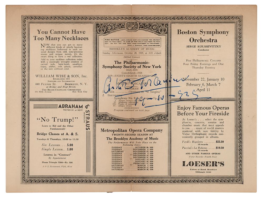 Program for a concert at the Brooklyn Academy of Music on October 20, 1929, 12 x 9, signed at the center in bold blue fountain pen, "Arturo Toscanini, 19-10-929." In very good to fine condition, with faint toning to the central vertical fold, and heavier toning and mounting remnants on the reverse.
