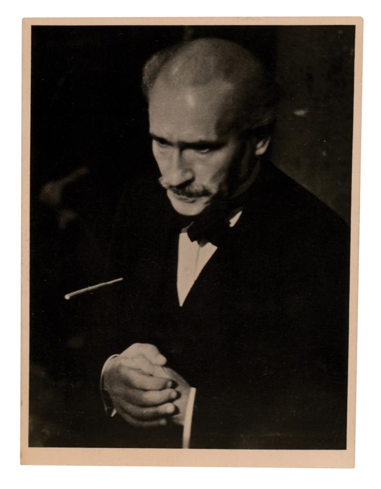 Two unsigned items: a small vintage matte-finish 3.5 x 4.5 postcard photo of Arturo Toscanini with his hands clasped; and an original program for the performance of the Philharmonic Society of New York on February 2, 1927, under Toscanani's direction, eight pages, 6 x 9, to feature two of Beethoven's symphonies. In fine condition.