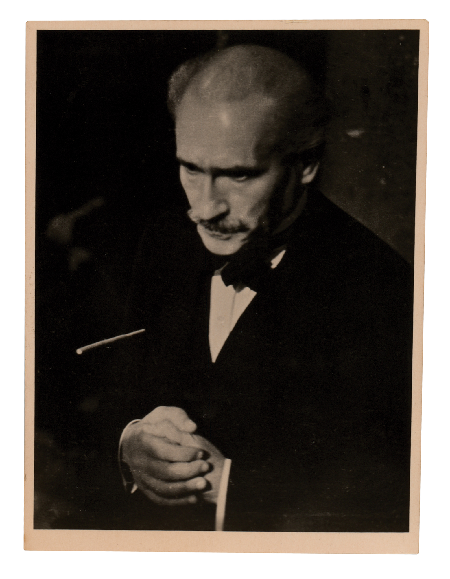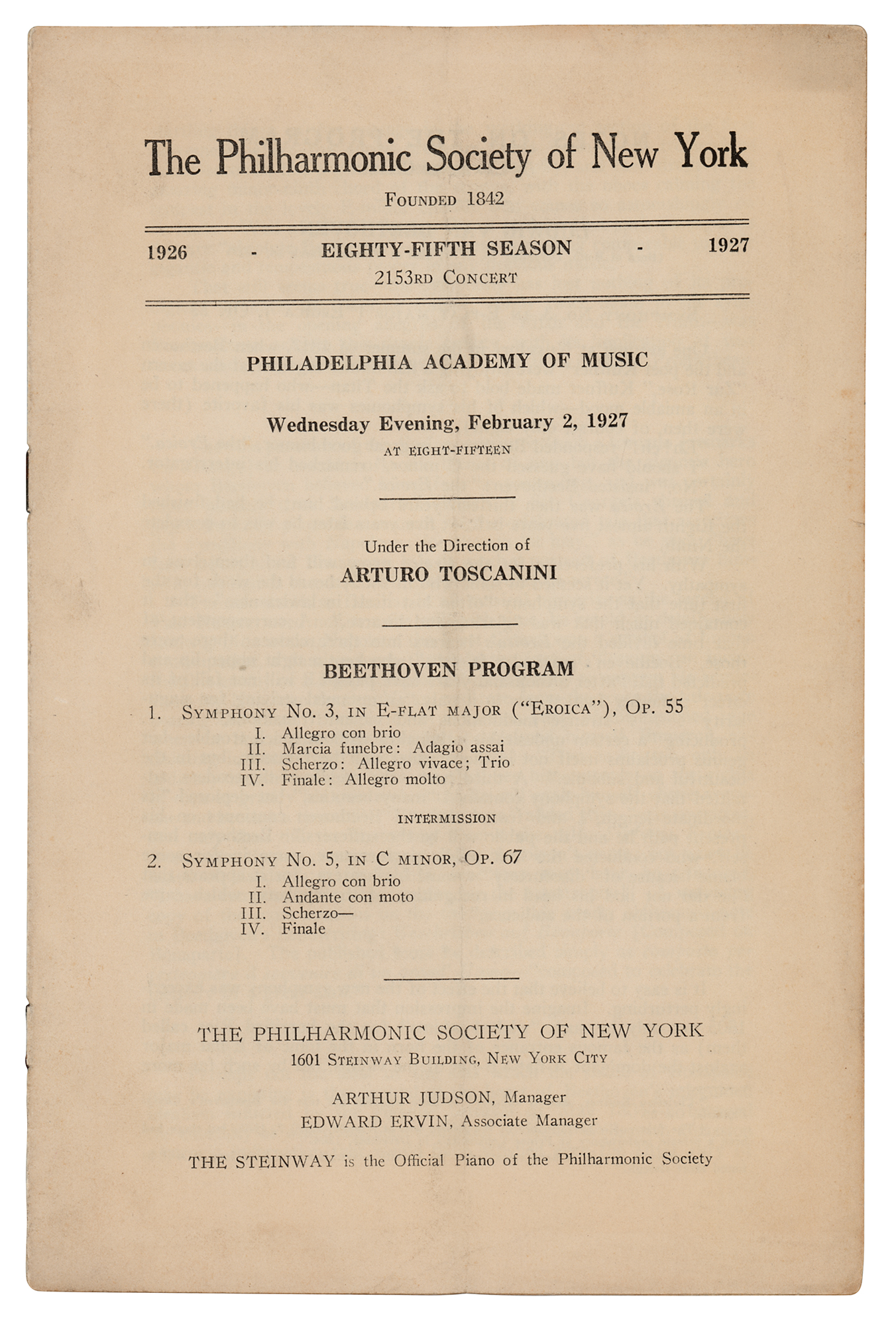 Two unsigned items: a small vintage matte-finish 3.5 x 4.5 postcard photo of Arturo Toscanini with his hands clasped; and an original program for the performance of the Philharmonic Society of New York on February 2, 1927, under Toscanani's direction, eight pages, 6 x 9, to feature two of Beethoven's symphonies. In fine condition.