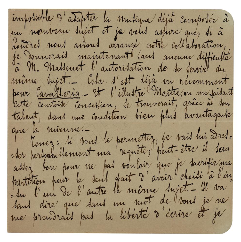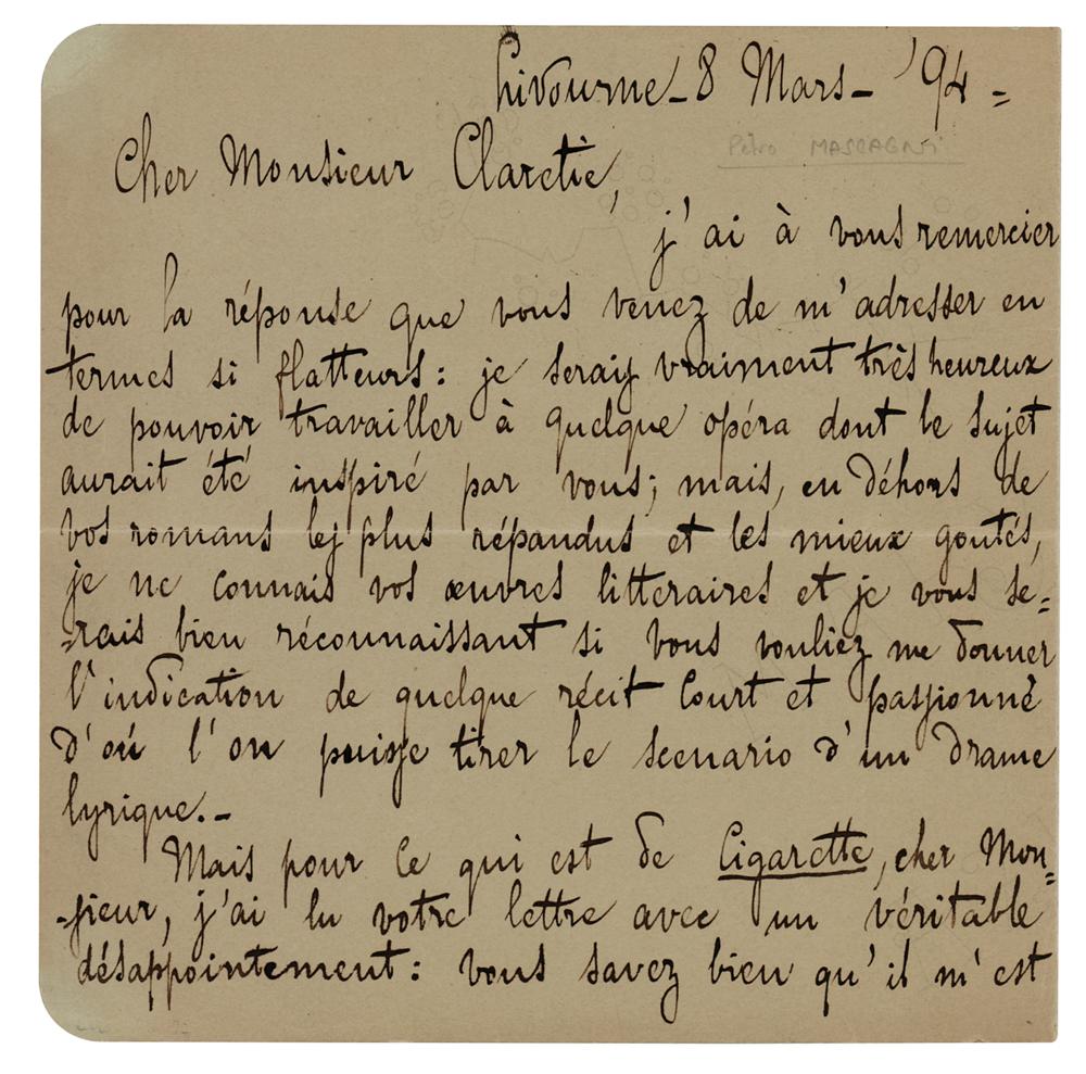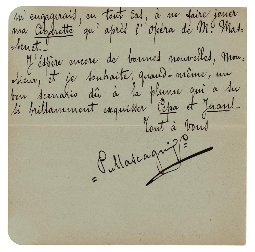 Italian composer (1863-1945) whose 1890 masterpiece ‘Cavalleria rusticana’ takes a place among the most beloved staples of the operatic repertoire. ALS in Italian, signed “P. Mascagni,” three pages on two adjoining sheets, 6 x 6, March 8, 1894. Handwritten letter to novelist Jules Claretie, in part: "I would be truly very happy to be able to work on an opera whose subject were inspired by you, but except for your best known and most appreciated novels, I do not know your literary work and I would be very grateful to you if you would direct me to a short and passionate story that could be turned into the scenario for a lyrical drama. But as for Cigarette, dear Sir, I read your letter with real disappointment: you know quite well that I cannot adopt the music that was already composed to a new topic…I would give authorization now without any difficulty to Mr. Massenet to use the same story line. We've seen this done recently with Cavalleria…It goes without saying that without a word from you I will not take the liberty to write and will promise, no matter what, to have my Cigarette performed only after Mr. Massenet's opera." In fine condition. A significant association piece, connecting the worlds of literature and music in fin de siècle France.