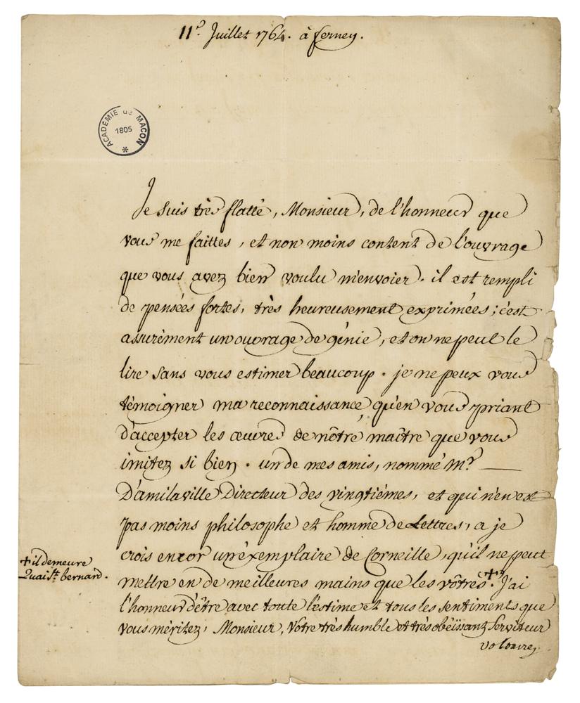 Voltaire sent this letter from Ferney, where he lived for the last 20 years of his life after moving away from Geneva due to its ban on theater. He decided to become the enlightened 'patriarch' of the little village, and initiated the development of pottery, watchmaking, and theater industries in the town; his influence was so profound that the community was renamed Ferney-Voltaire after the French Revolution.