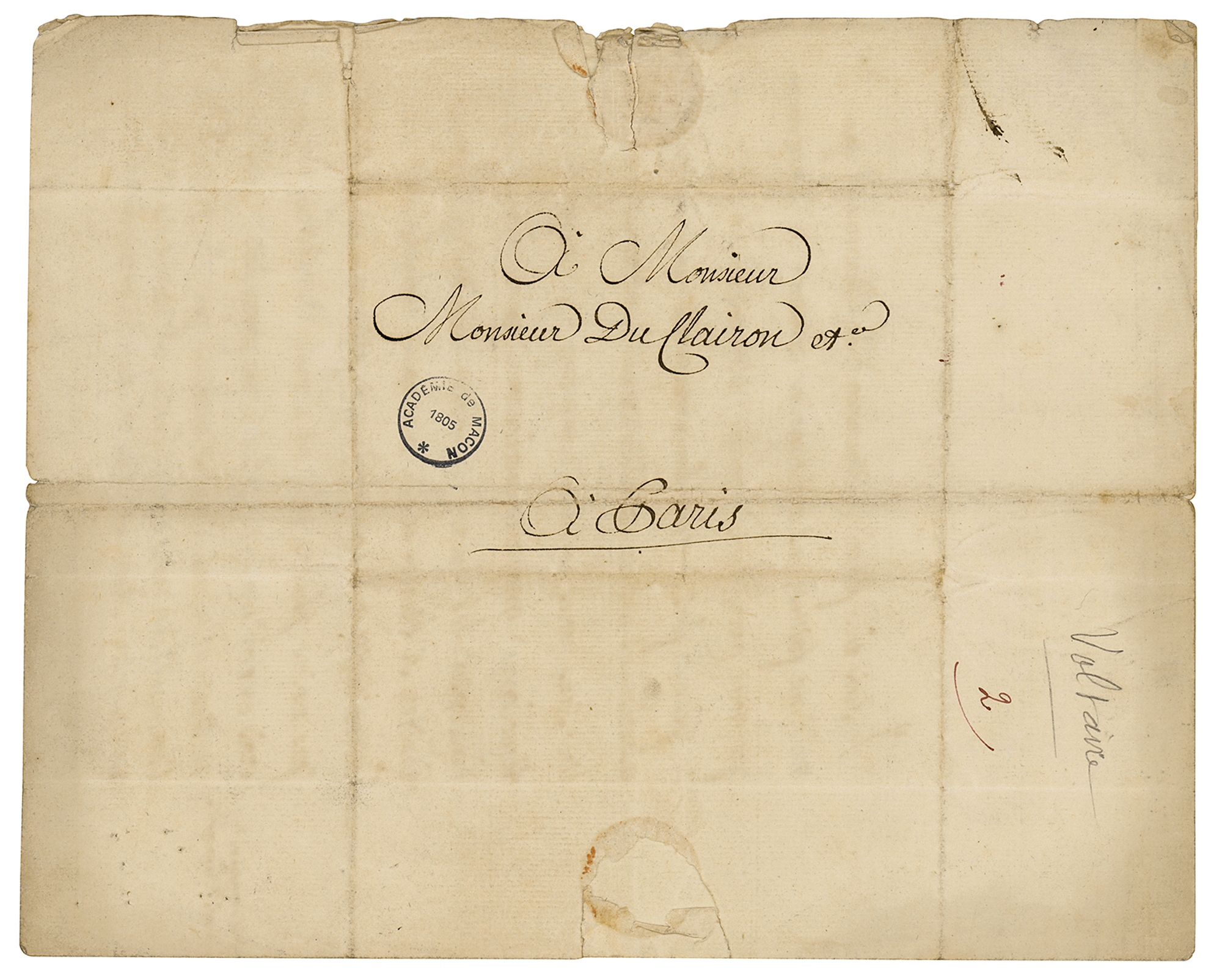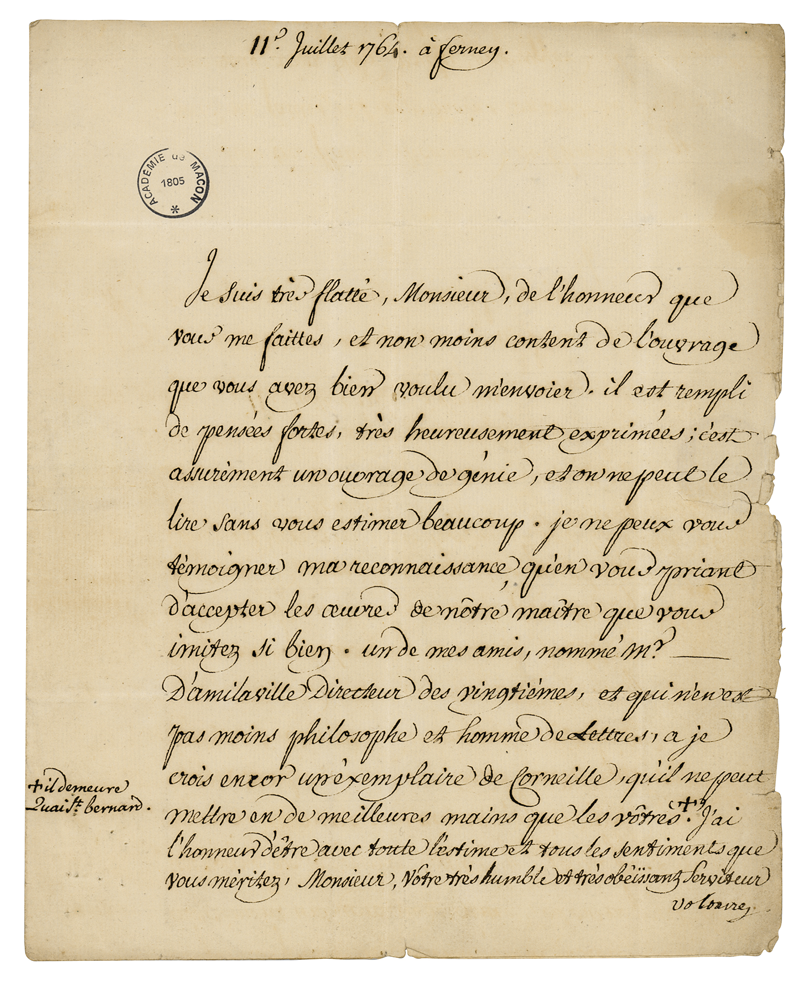 Voltaire sent this letter from Ferney, where he lived for the last 20 years of his life after moving away from Geneva due to its ban on theater. He decided to become the enlightened 'patriarch' of the little village, and initiated the development of pottery, watchmaking, and theater industries in the town; his influence was so profound that the community was renamed Ferney-Voltaire after the French Revolution.