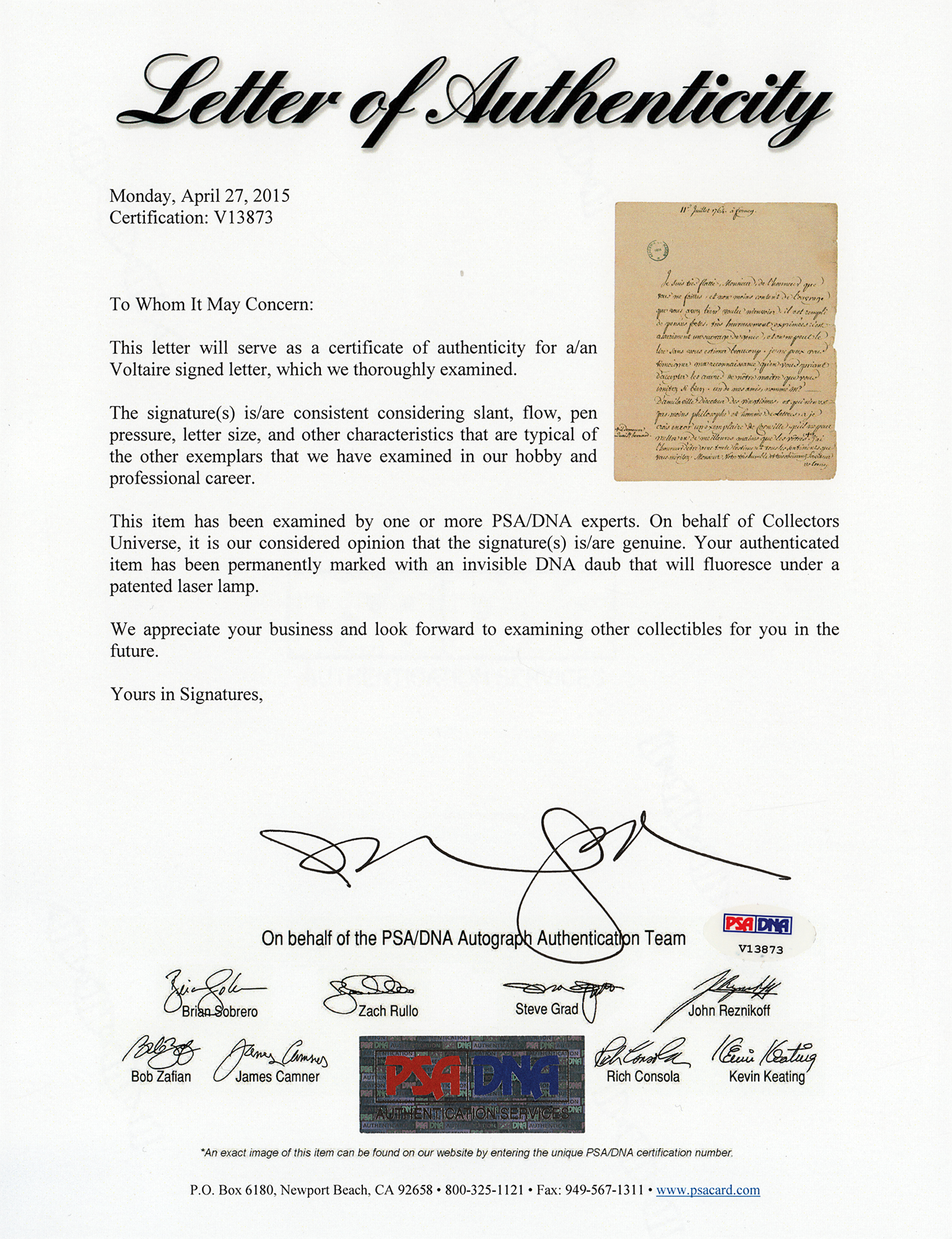 LS in French, one page, 7.25 x 9, July 11, 1764. Letter to Antoine Maillet du Clarion in Paris, thanking him for the work he sent. In part (translated): "It is filled with strong thoughts very successfully expressed; it is certainly an engineering work, and one can not read it without holding you in high esteem." In very good to fine condition, with edge wear, including short edge tears. Accompanied by a full letter of authenticity from PSA/DNA.