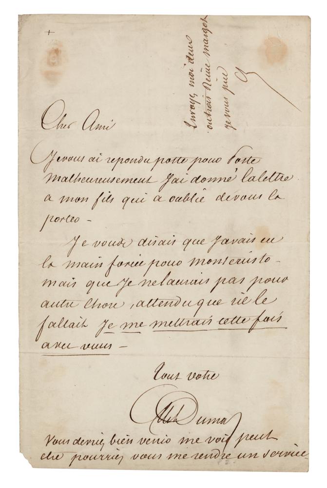 Prolific French writer (1802-1870) known for such classics as The Count of Monte Cristo and The Three Musketeers. ALS in French, signed "Alec. Dumas," one page, 5.25 x 8.25, no date. Untranslated handwritten letter by Alexandre Dumas, pere. Dumas adds an initialed postscript to the upper right. In fine condition, with two small spots of toning (and an associated small tear) to the top margin. Accompanied by a full letter of authenticity from PSA/DNA.