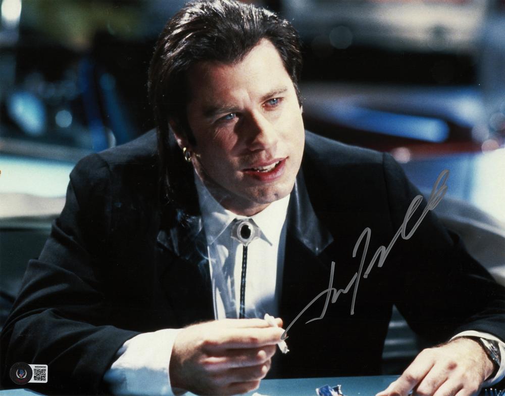 Color satin-finish 14 x 11 photo of John Travolta as Vincent Vega in Pulp Fiction, signed in silver ink. In fine condition, with a Beckett label affixed to the lower left corner.